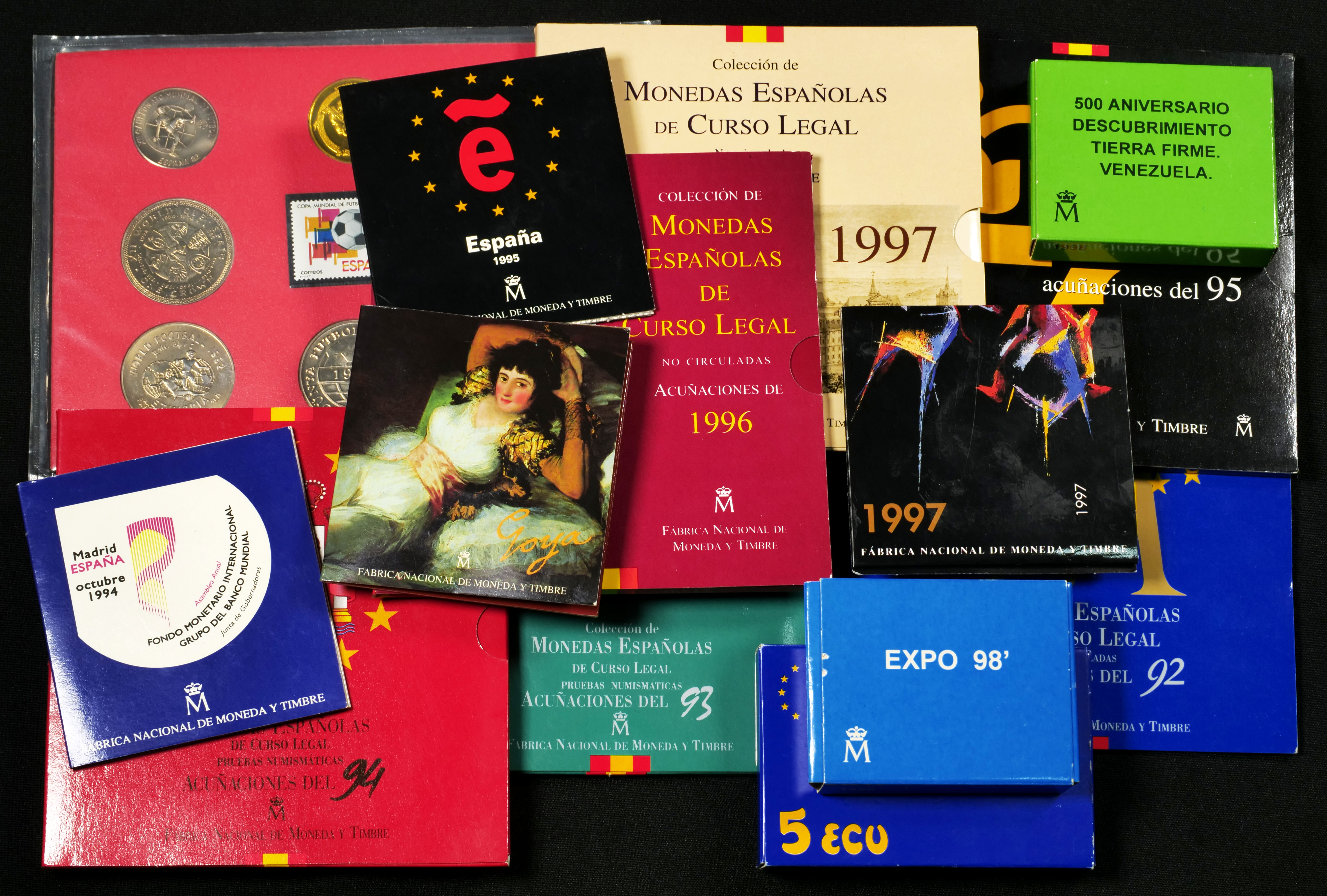 Lote de 13 Estuches-carteras oficiales de Juan Carlos I. Conteniendo Series Básicas de los años 1992/93/94/95/96 y 97. Emisiones especiales en plata como: 2.000 Pesetas 1994, 2.000 Pesetas 1995, 2.000 Pesetas 1996, 5 Ecu 1996 Menorca, 2.000 Pesetas 1997, 3 Euro 1998 Venezuela y 1.000 Pesetas 1998 Expo '98. Set mundial 1982. Es imprescindible un riguroso examen. NO SE ADMITE DEVOLUCIÓN. SC. Est...300,00.