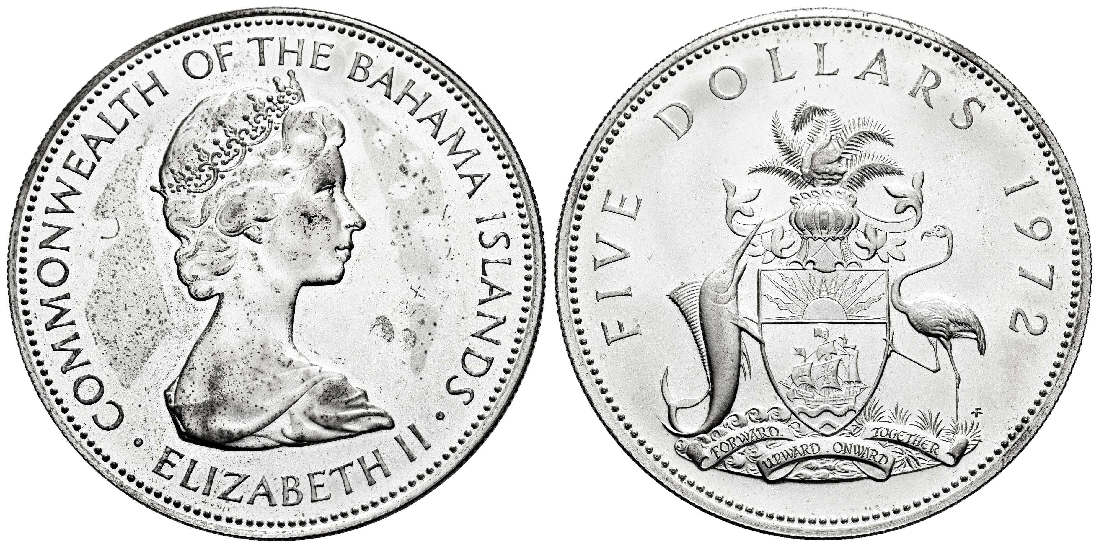 Bahamas. Elizabeth II. 5 dollars. 1972. (Km-33). Ag. 42,00 g. Manchitas en anverso. SC. Est...60,00.