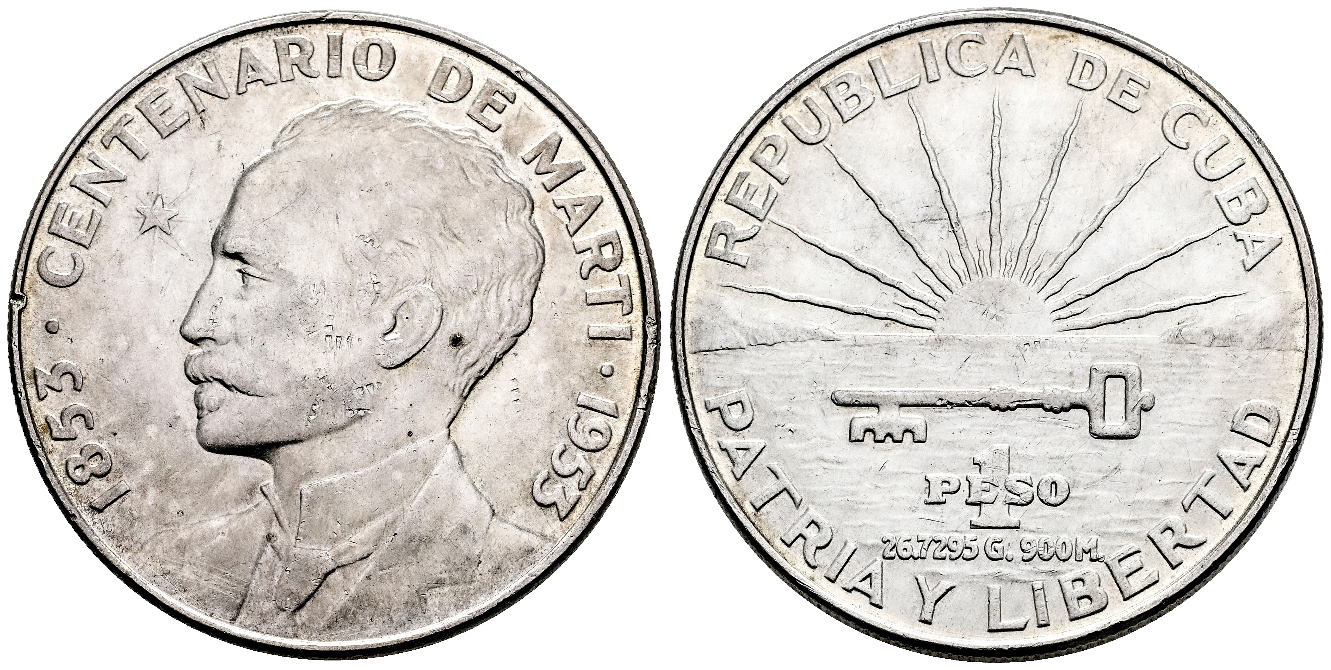 Cuba. 1 peso. 1953. (Km-29). Ag. 26,66 g. Mínimo golpe en canto. Centenario del Nacimiento de José Martí. Brillo original. EBC. Est...45,00.