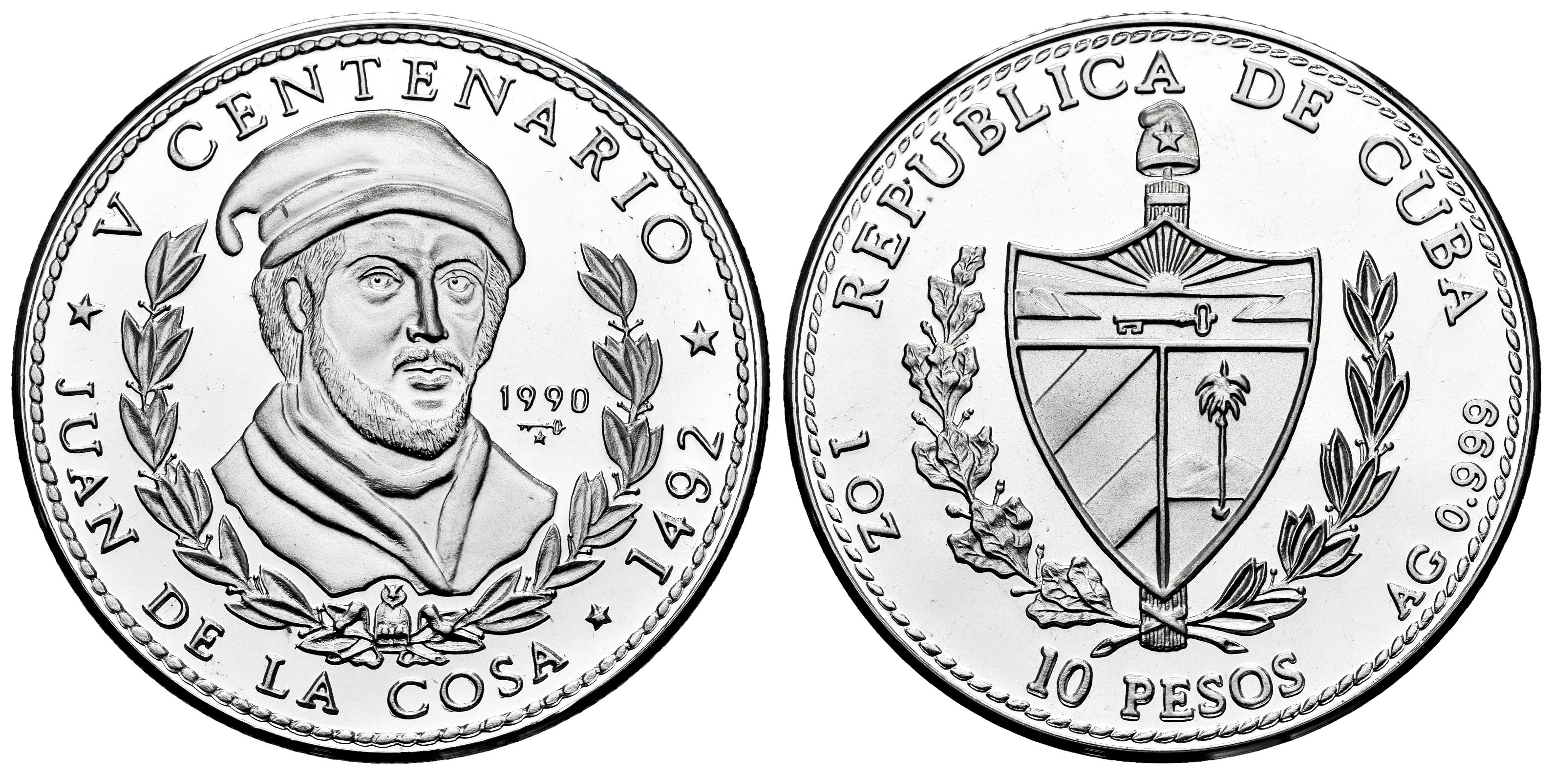 Cuba. 10 pesos. 1990. La Habana. (Km-266). Ag. 31,08 g. Juan de la Cosa. Tirada de 5000 piezas. PROOF. Est...80,00.