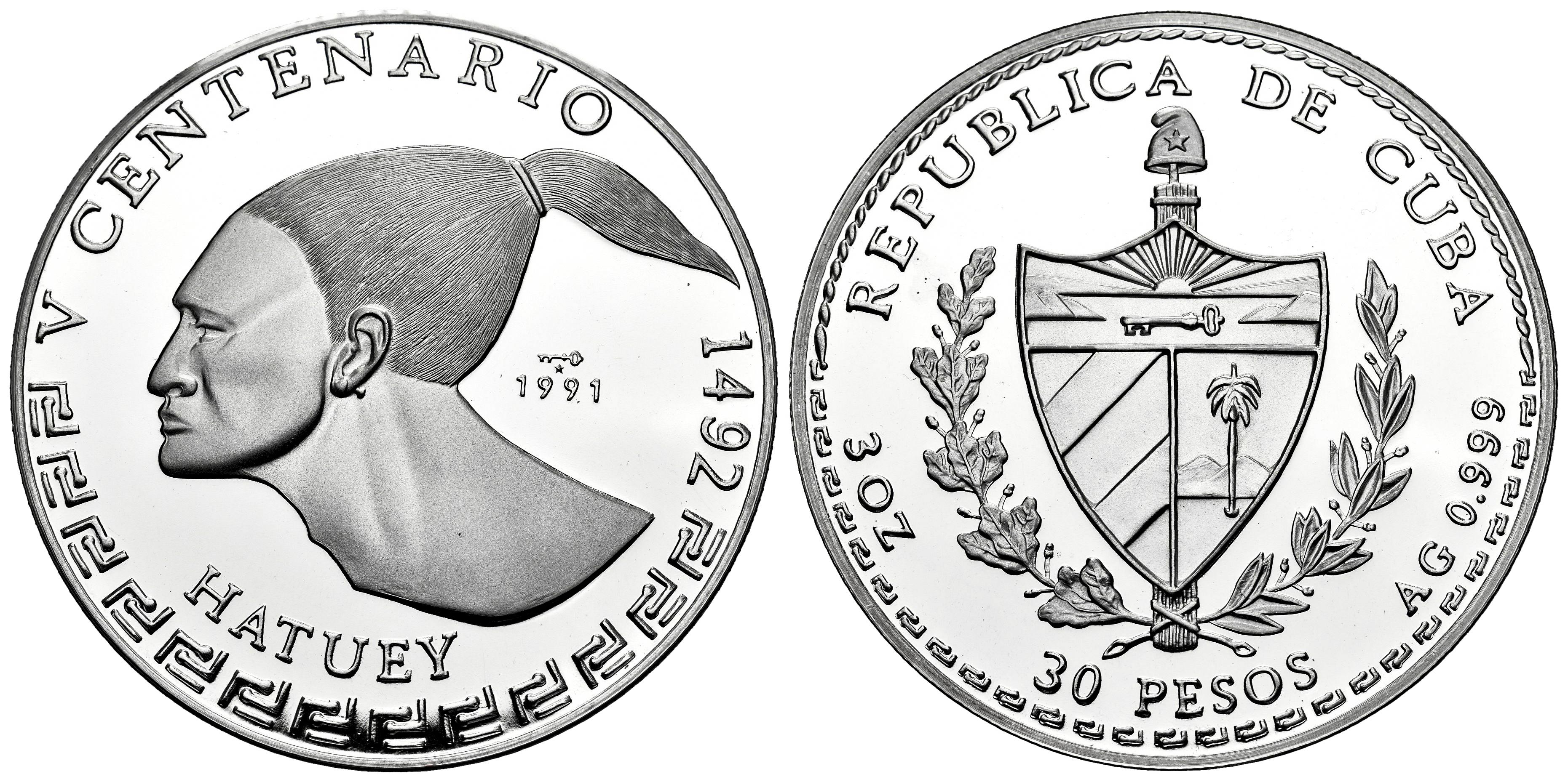 Cuba. 30 pesos. 1991. La Habana. (Km-423). Ag. 93,27 g. Hatuey. Tirada de 1000 piezas. PROOF. Est...250,00.