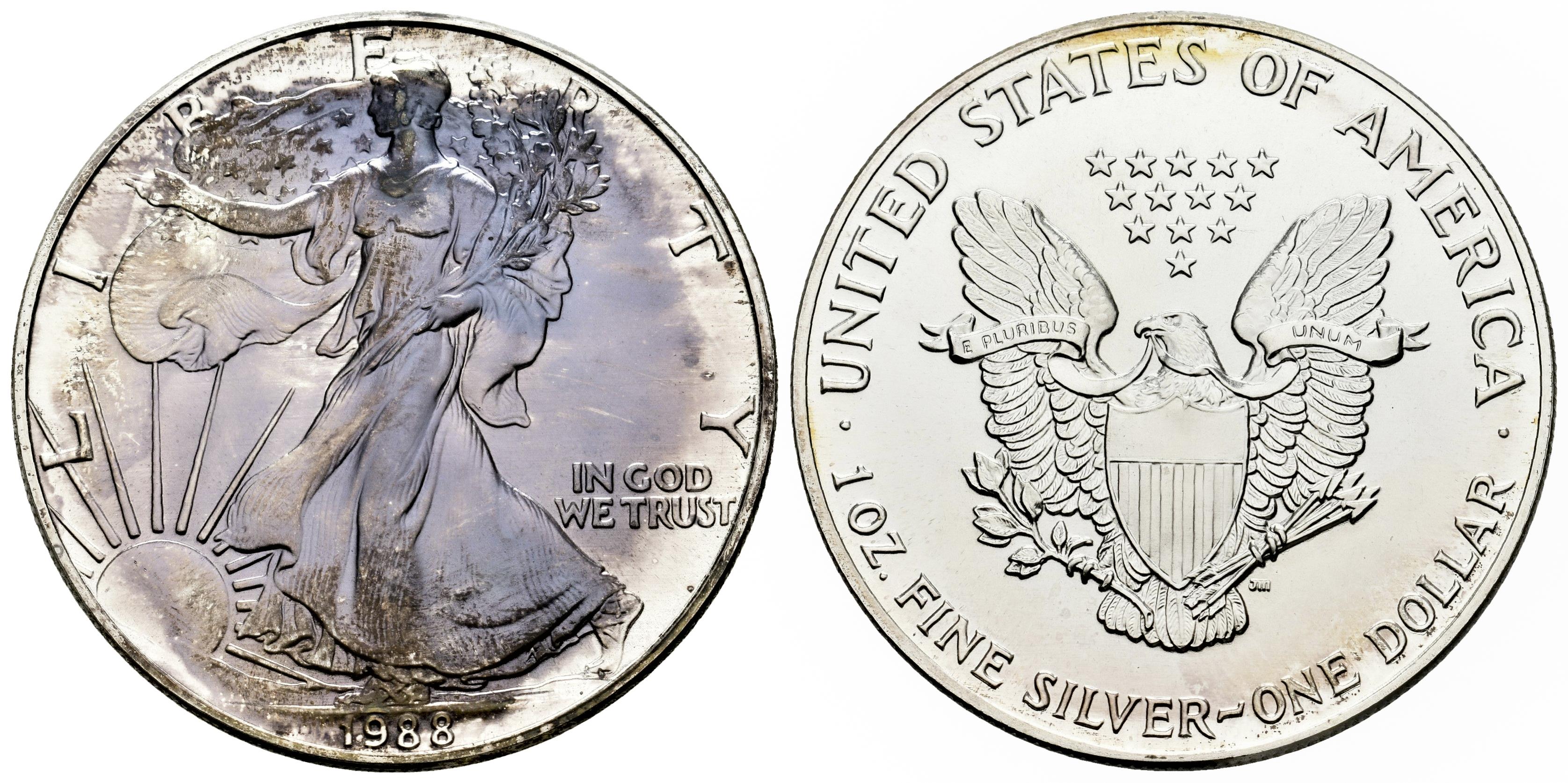 Estados Unidos. 1 dollar. 1988. (Km-273). Ag (0.999). 31,40 g. "American Silver Eagle" (Bullion Coin). Suave tono. SC. Est...45,00.