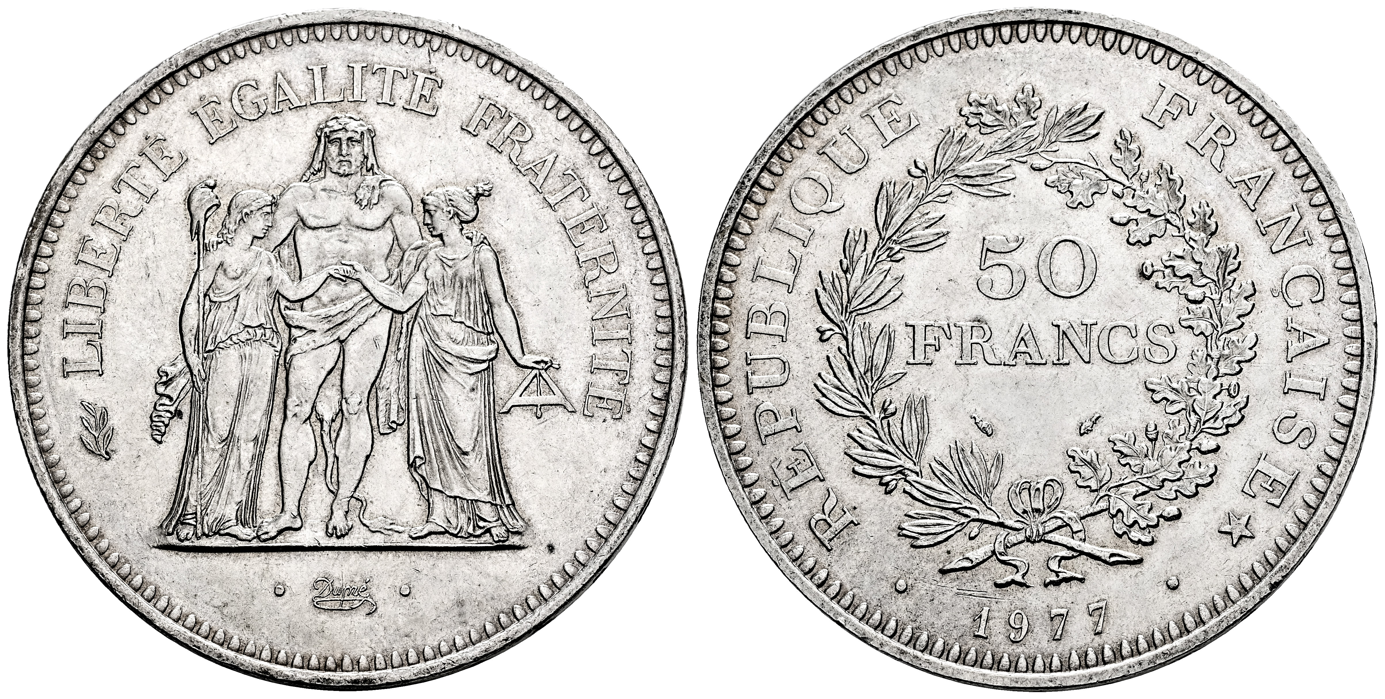 Francia. 50 francs. 1977. (Km-941). (Gad-882). Ag (0.900). 30,01 g. Brillo original. SC-. Est...60,00.
