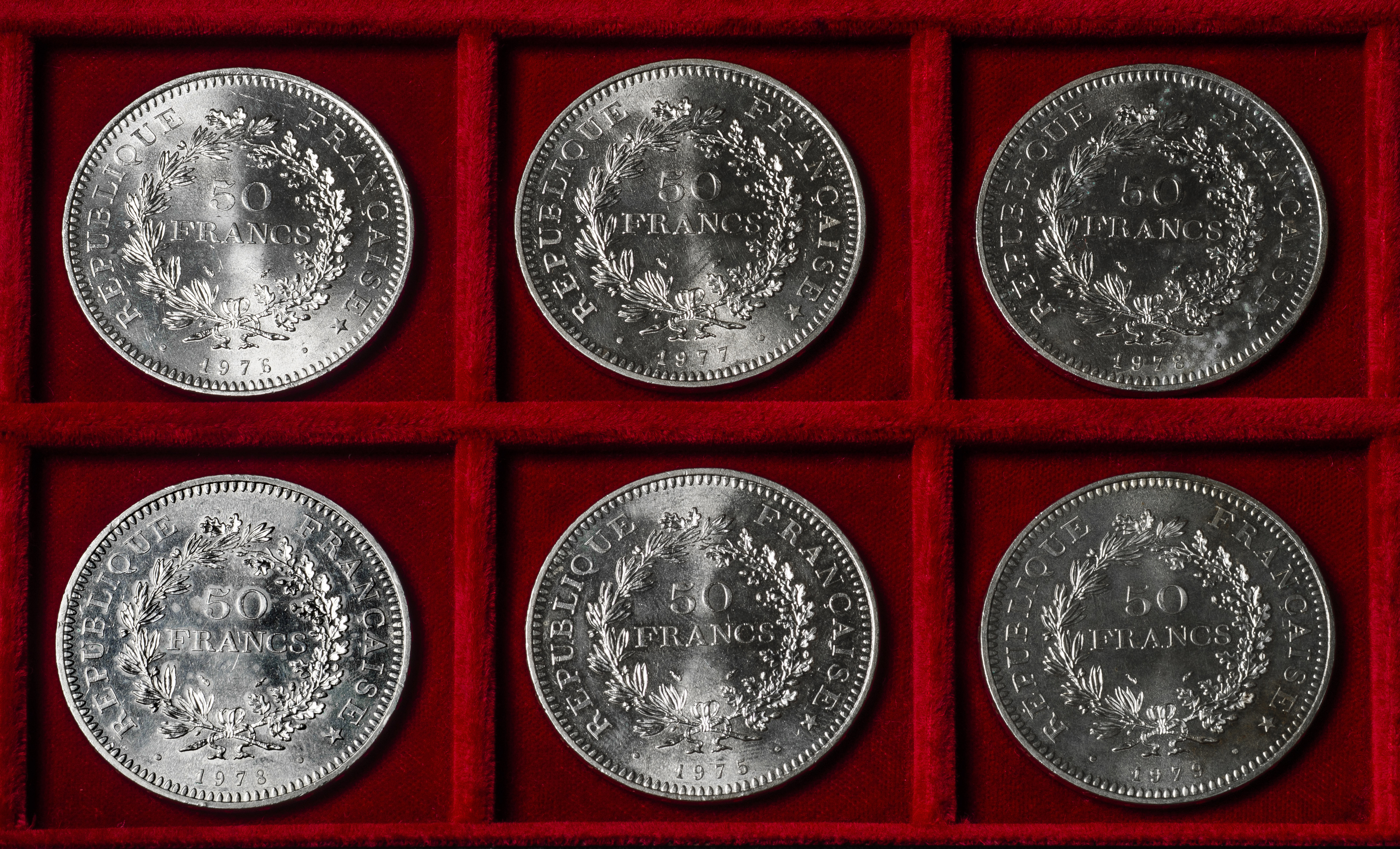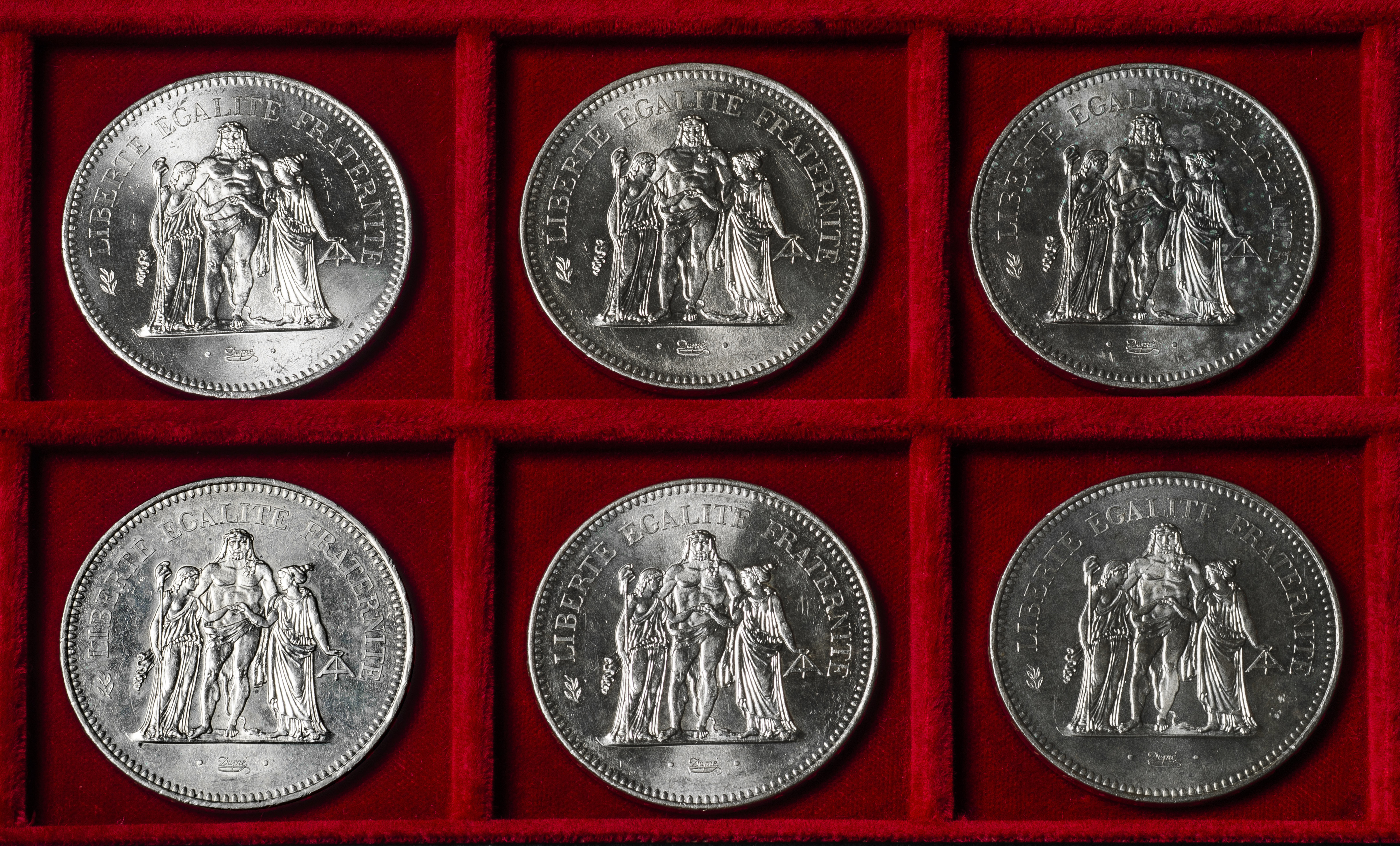 Francia. Lote de 6 monedas de 50 francs. Ag. 179,67 g. 0,900 milésimas. Es imprescindible un riguroso examen. NO SE ADMITE DEVOLUCIÓN. EBC/SC. Est...300,00.