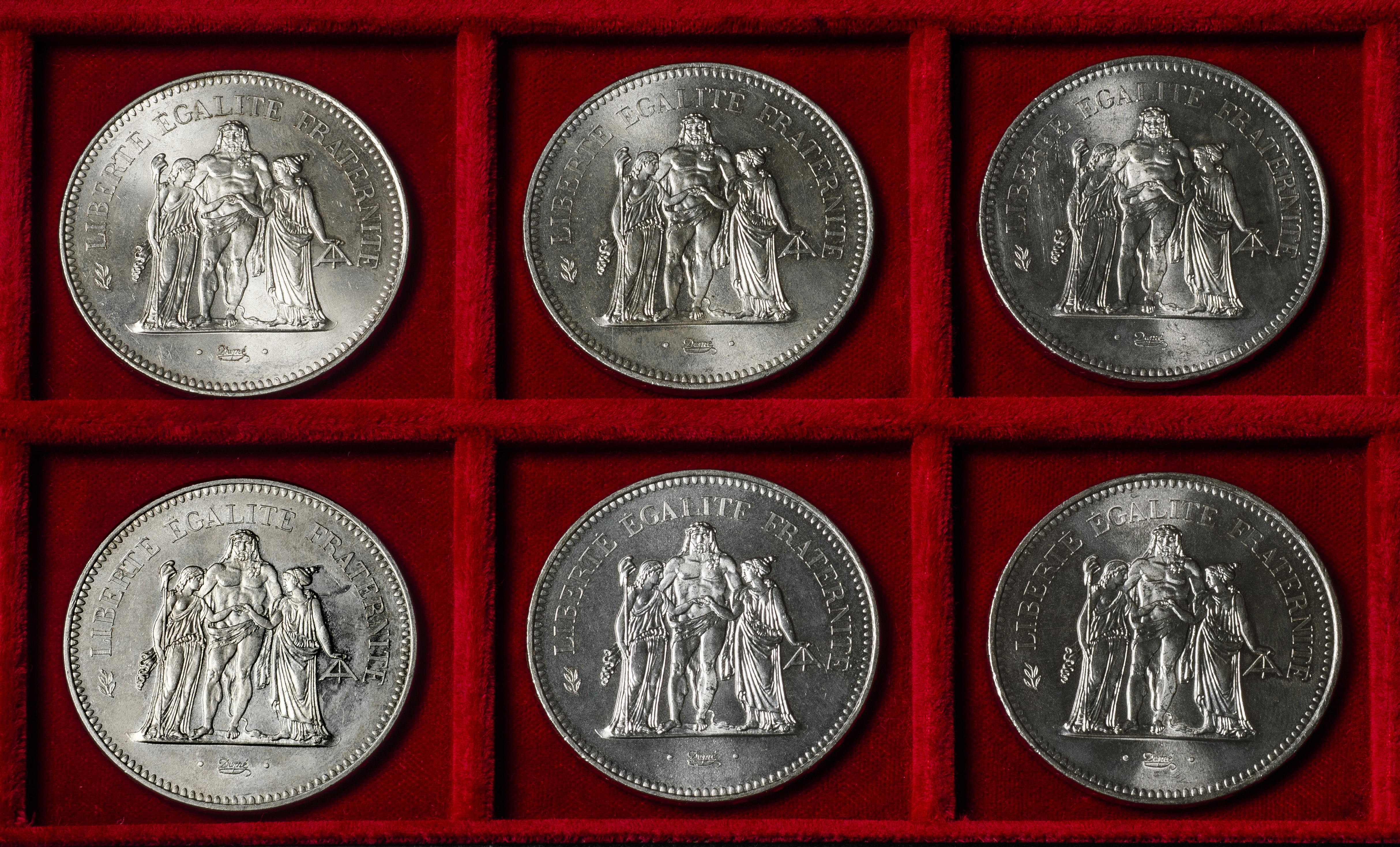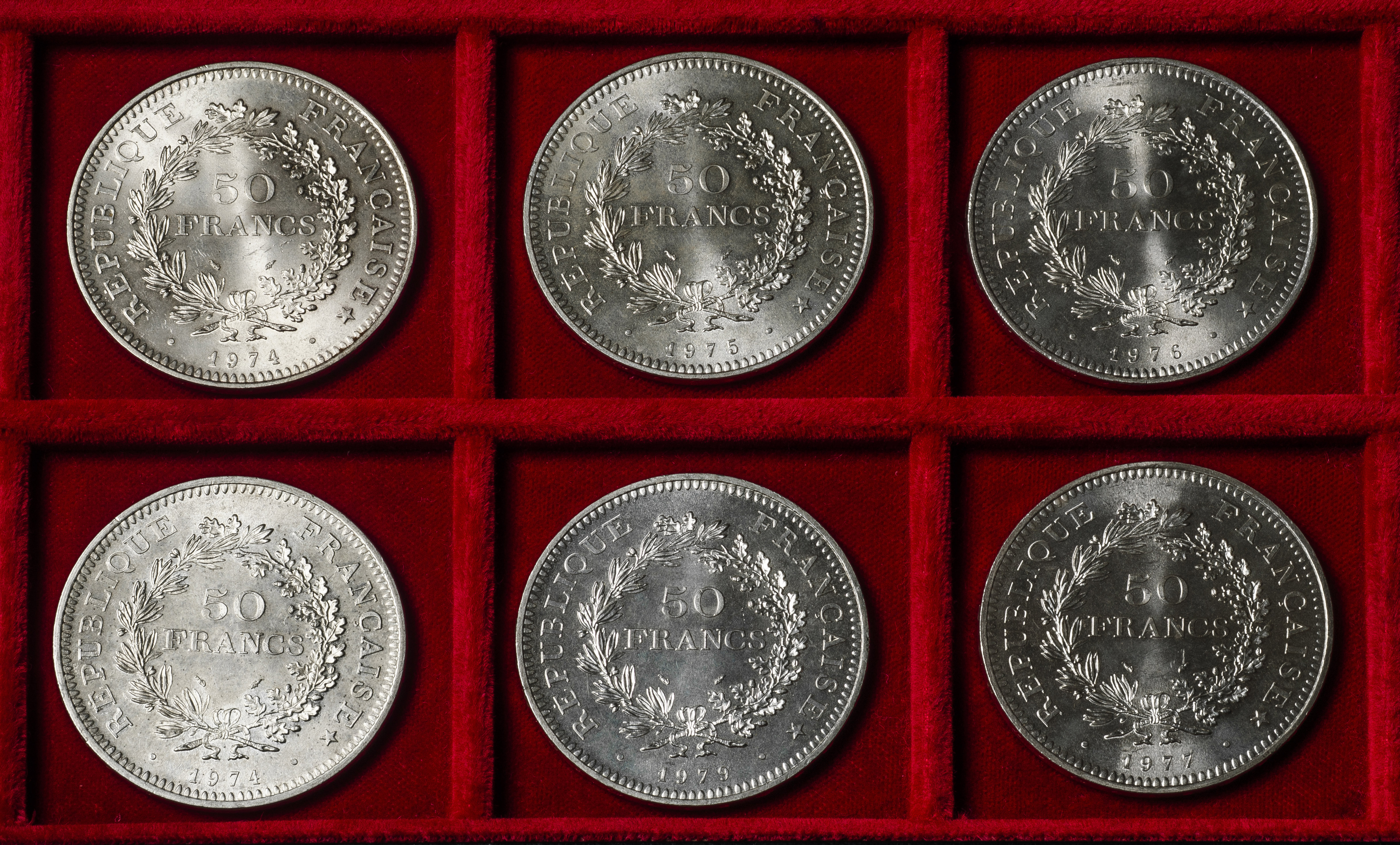 Francia. Lote de 6 monedas de 50 francs. Ag. 180,03 g. 0,900 milésimas. Es imprescindible un riguroso examen. NO SE ADMITE DEVOLUCIÓN. EBC/SC. Est...300,00.