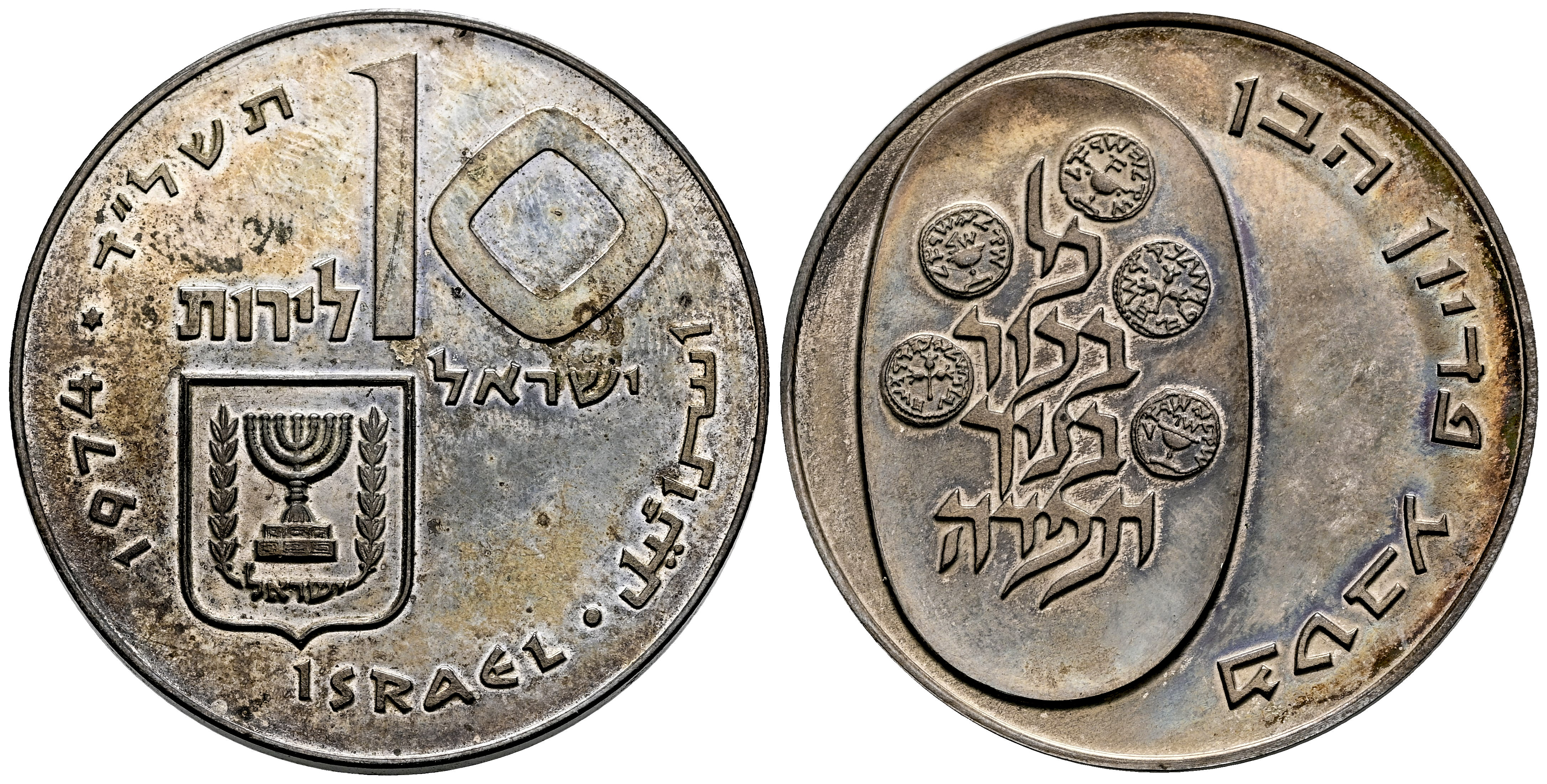 Israel. 10 lirot. 1974. (Km-76.1). Ag. 25,96 g. Bonita pátina. Brillo original. SC. Est...50,00.