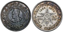 Marruecos. Mohamad V. 500 francs. 1376 H (1956). (Km-Y#54). Ag. 22,46 g. Pátina en anverso, suave tono en reverso. EBC-. Est...40,00.