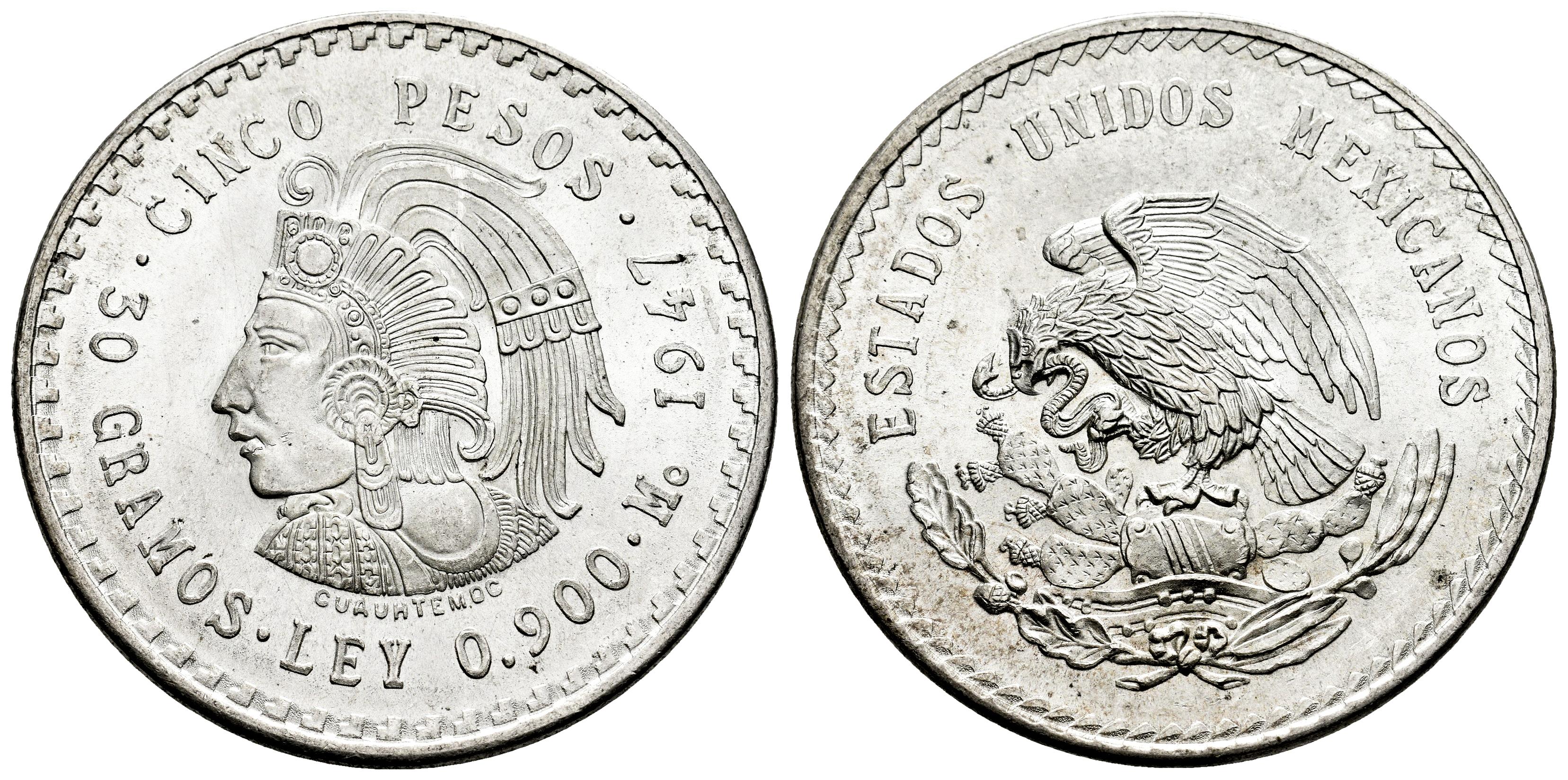 México. 5 pesos. 1947. México. (Km-465). Ag. 30,03 g. Pleno brillo original. SC-. Est...60,00.