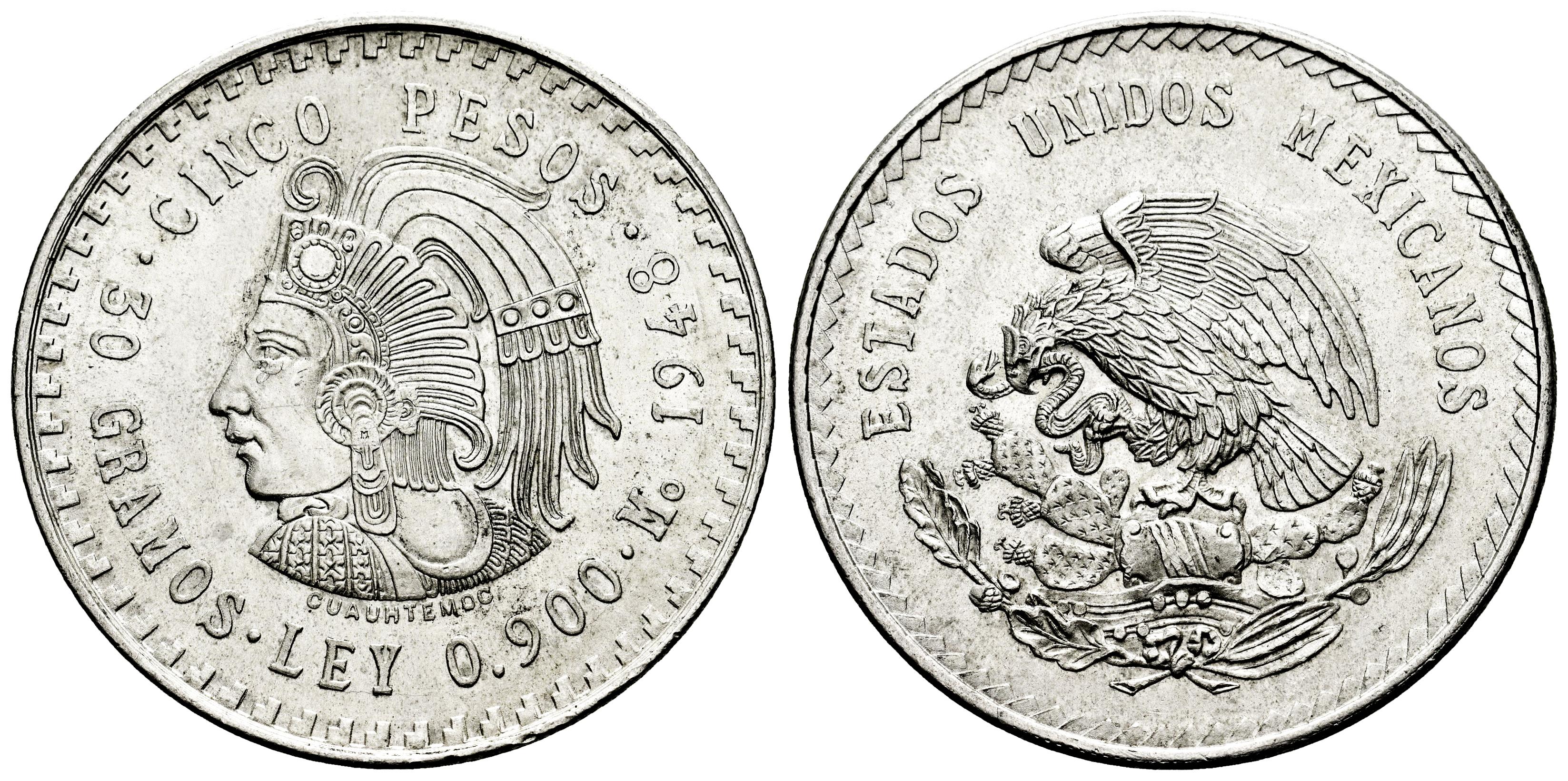 México. 5 pesos. 1948. México. (Km-465). Ag. 30,00 g. Brillo original. SC-. Est...60,00.