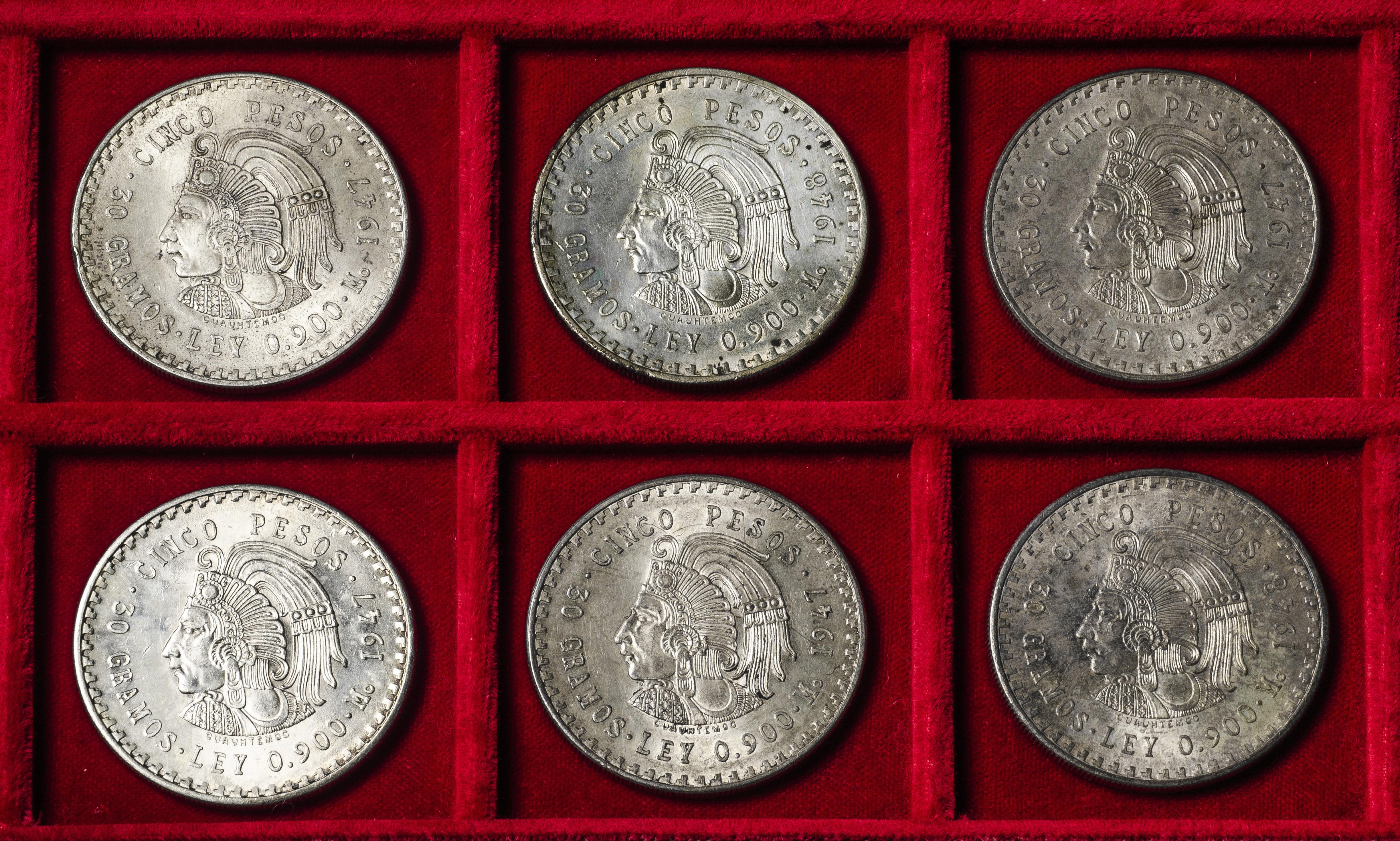 México. Lote de 6 monedas de 5 pesos. Ag. 180,36 g. 0,900 milésimas. Es imprescindible un riguroso examen. NO SE ADMITE DEVOLUCIÓN. EBC/SC-. Est...300,00.