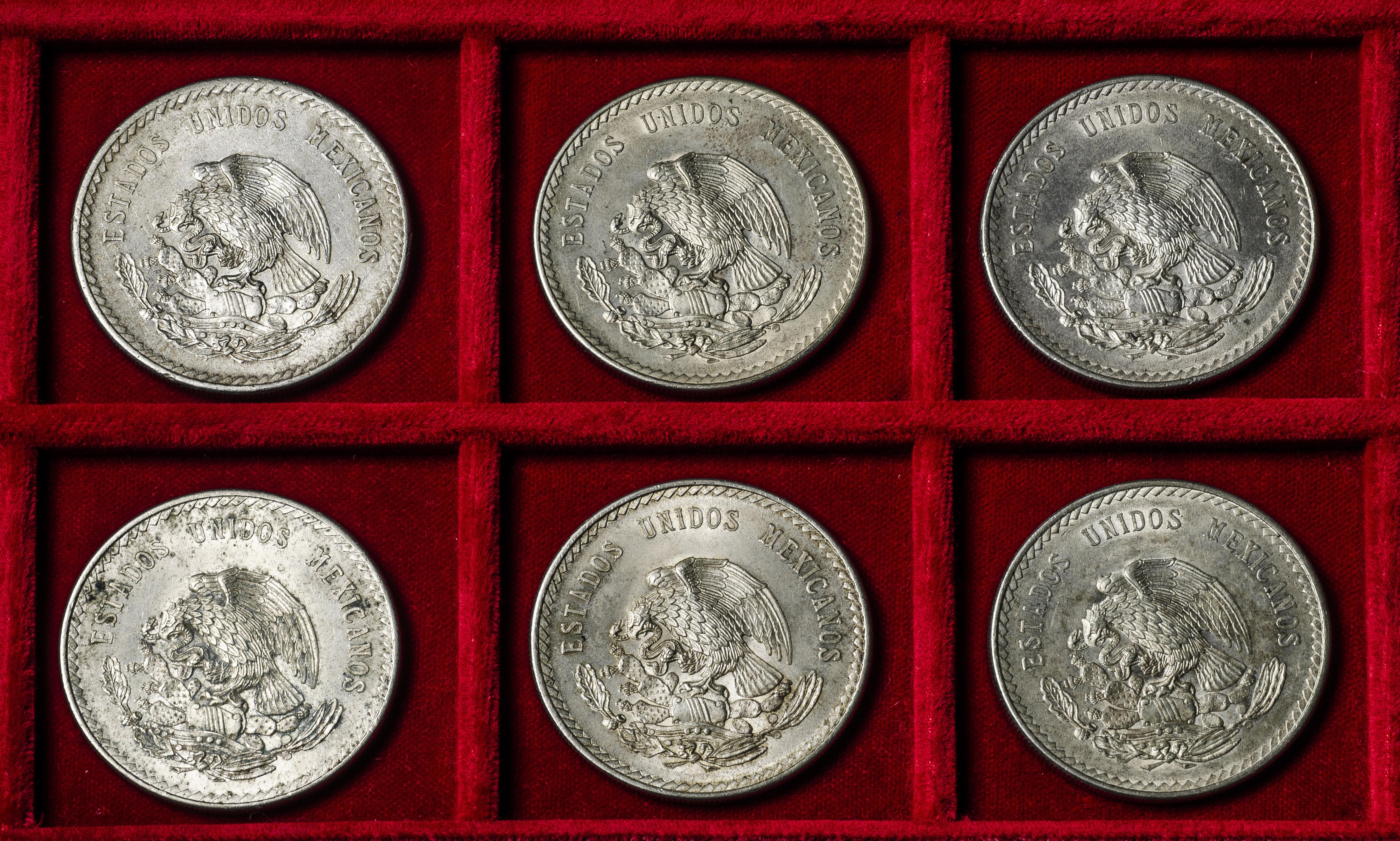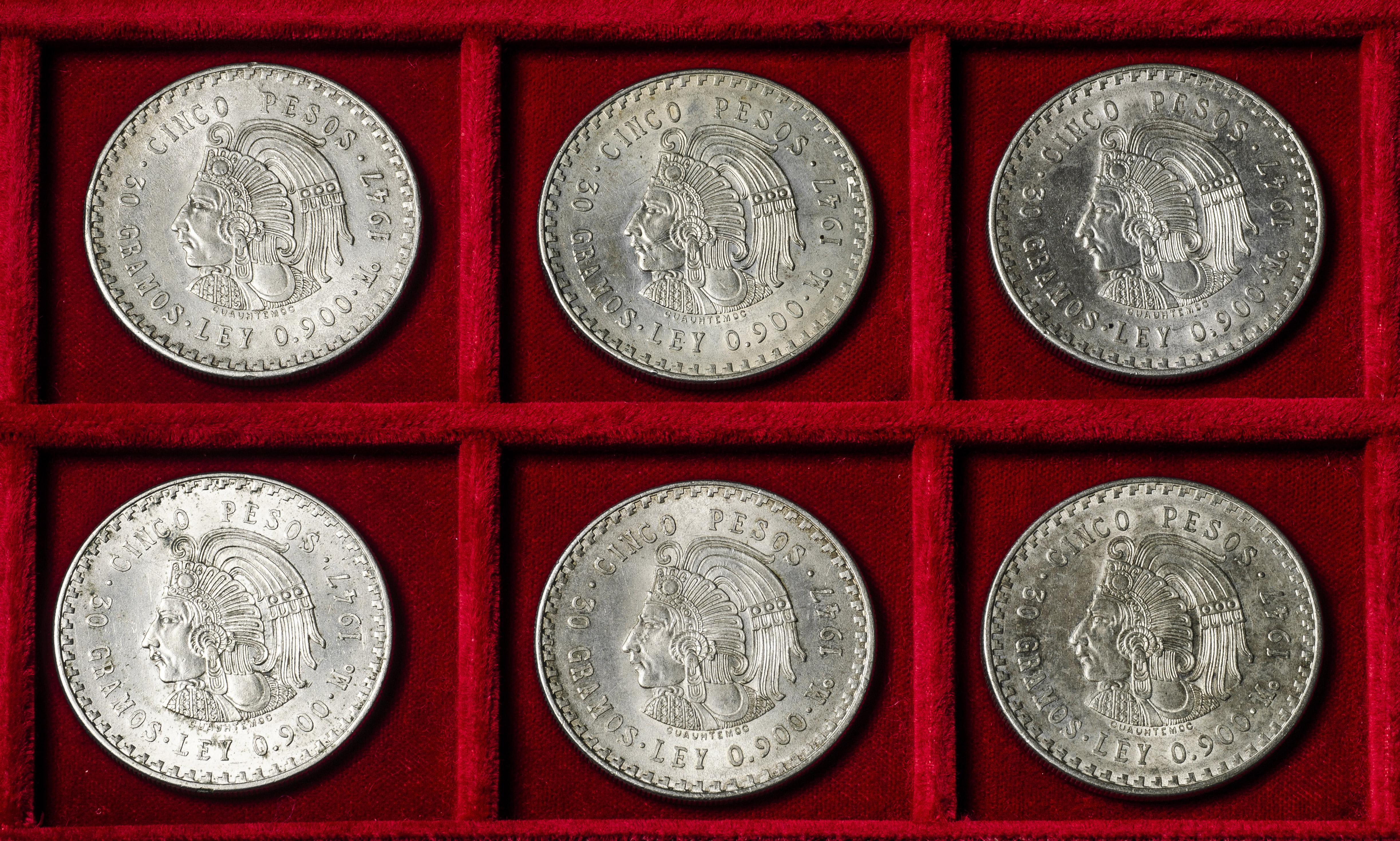 México. Lote de 6 monedas de 5 pesos. Ag. 180,37 g. 0,900 milésimas. Es imprescindible un riguroso examen. NO SE ADMITE DEVOLUCIÓN. EBC/SC-. Est...300,00.
