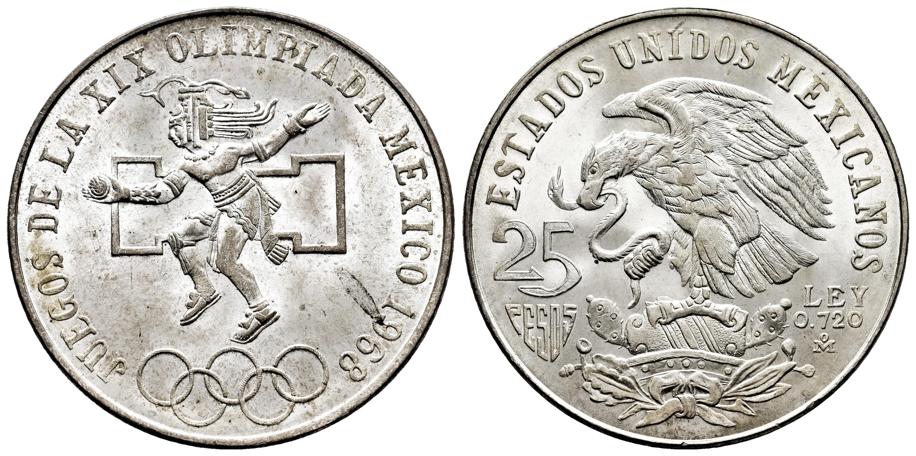 México. 25 pesos. 1968. México. (Km-479.1). Ag. 22,68 g. Juegos Olímpicos de México. Mínimo golpe en canto. Restos de brillo original. EBC+. Est...45,00.