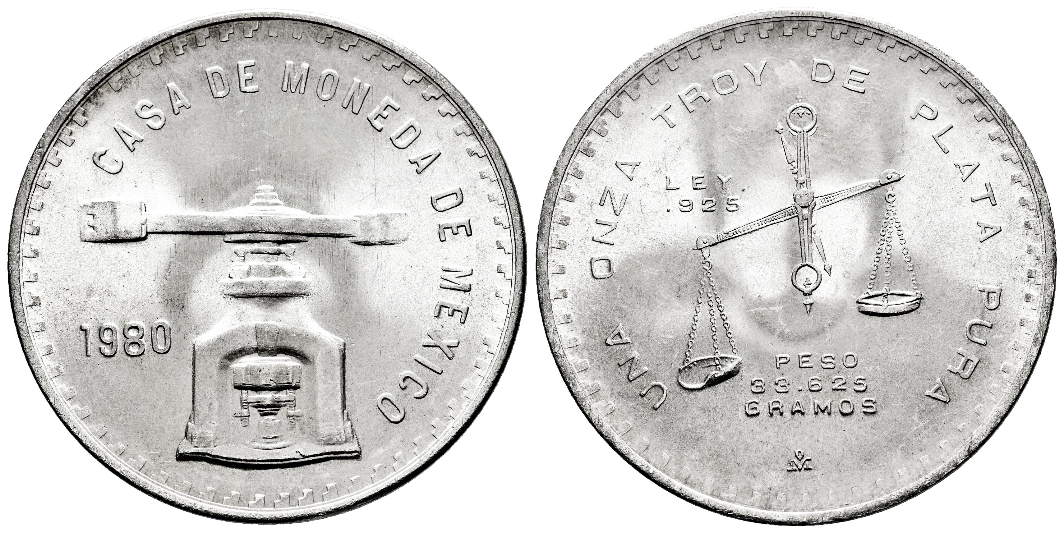 México. 1 onza. 1980. México. (Km-49b.5). Ag. 33,74 g. Brillo original. SC. Est...60,00.
