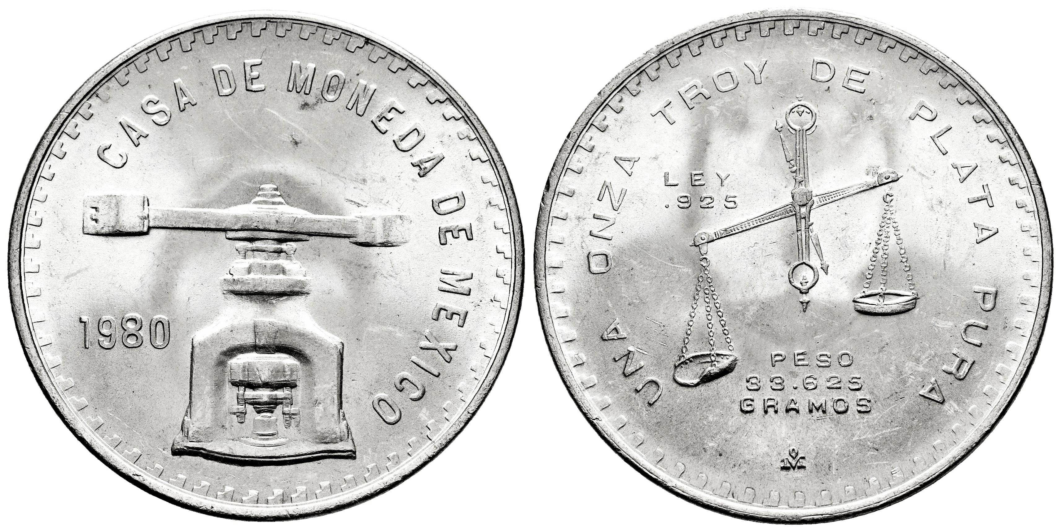 México. 1 onza. 1980. México. (Km-49b.5). Ag. 33,90 g. Brillo original. SC-. Est...60,00.