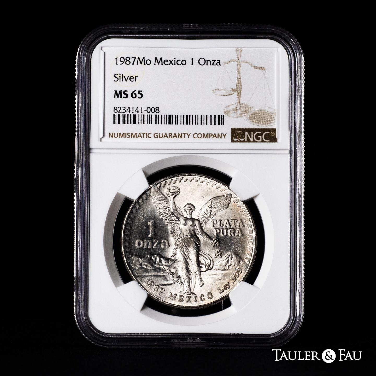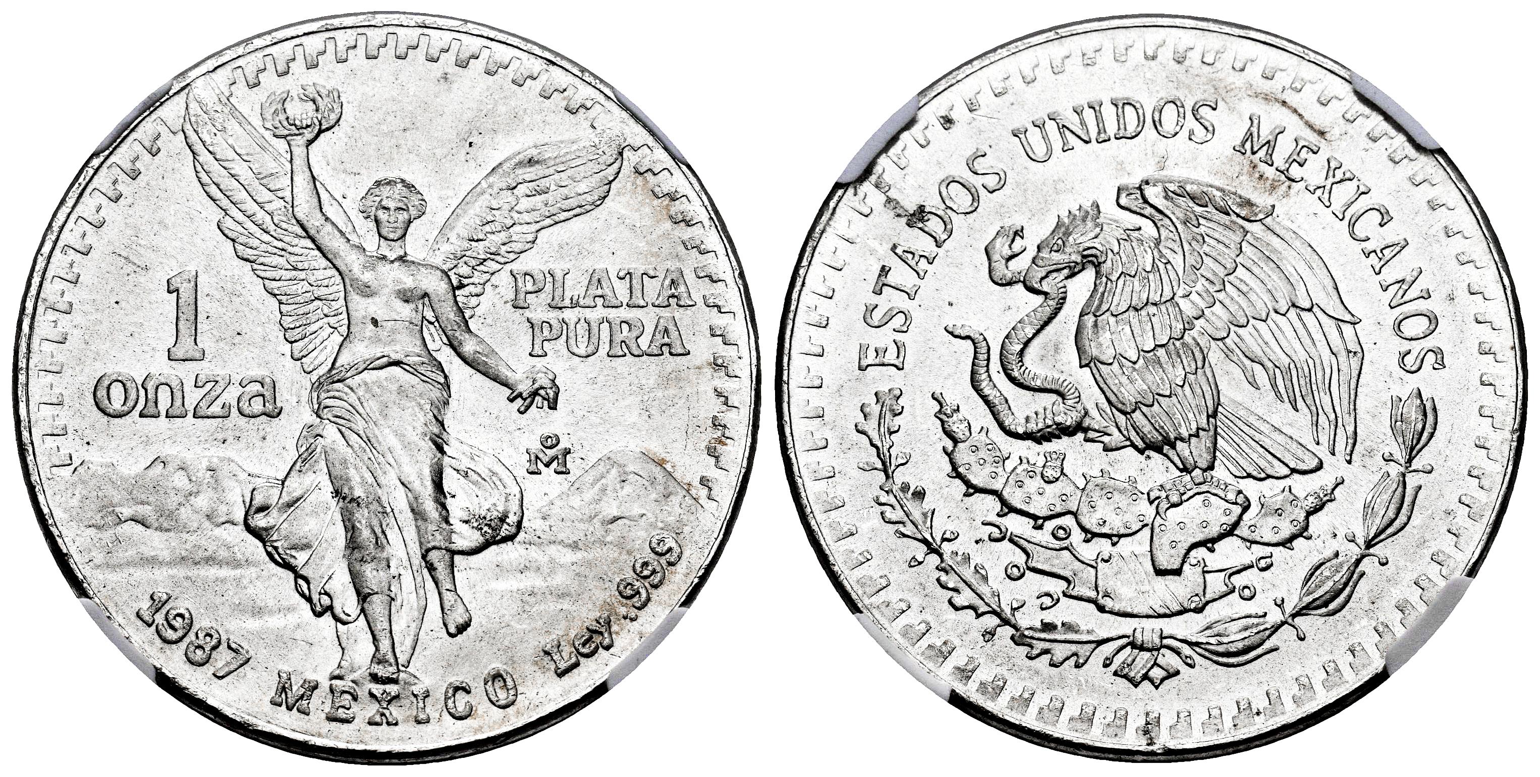 México. 1 onza. 1987. México. (Km-494.1). Ag. Pleno brillo original. Encapsulada por NGC como MS 65. Est...100,00.