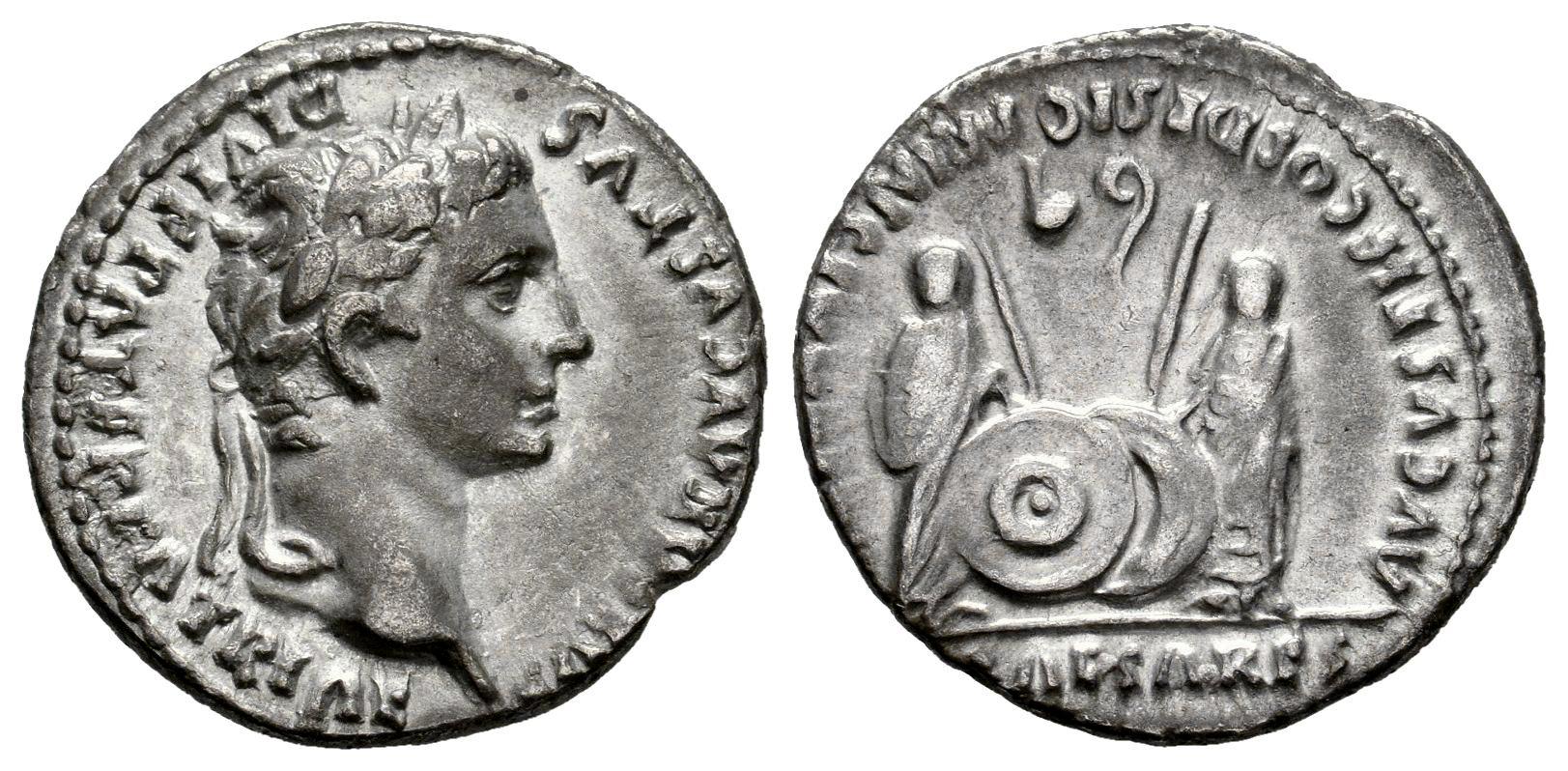 Augusto. Denario. 7-6 a.C. Lugdunum. (Ffc-22). (Ric-207). (Cal-852). Anv.: Cabeza laureada de Augusto a derecha,CAESAR AVGVSTVS DIVI. F.PATER. PATRIAE. Rev.: Cayus y Lucius Caesar de pie de frente, en medio sendos escudos, encima a izquierda, símpulo, a derecha, lituo, C.L. CAESARES AVGVSTI. F. COS. DESIG. PRINC. IVVENT. Ag. 3,47 g. MBC+. Est...300,00.