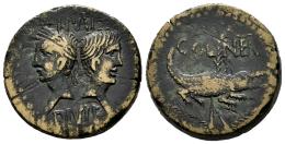 Augusto y Agripa. As. 10 a.C. - 10 d.C.. Nemausus, Galia. (Ric-I 158). (Rpc-I 524). (AMC-425). Anv.: Espalda con Espalda las cabezas laureada y con corona rostral de Agrippa a la izquierda, a la derecha la cabeza de Augusto con corona de roble; IMP arriba, DIVI F abajo. Rev.: Cocodrilo a la derecha, encadenado a una palmera detrás, arriba corona; COL-NEM en los campos. Ae. 12,35 g. MBC-. Est...90,00.