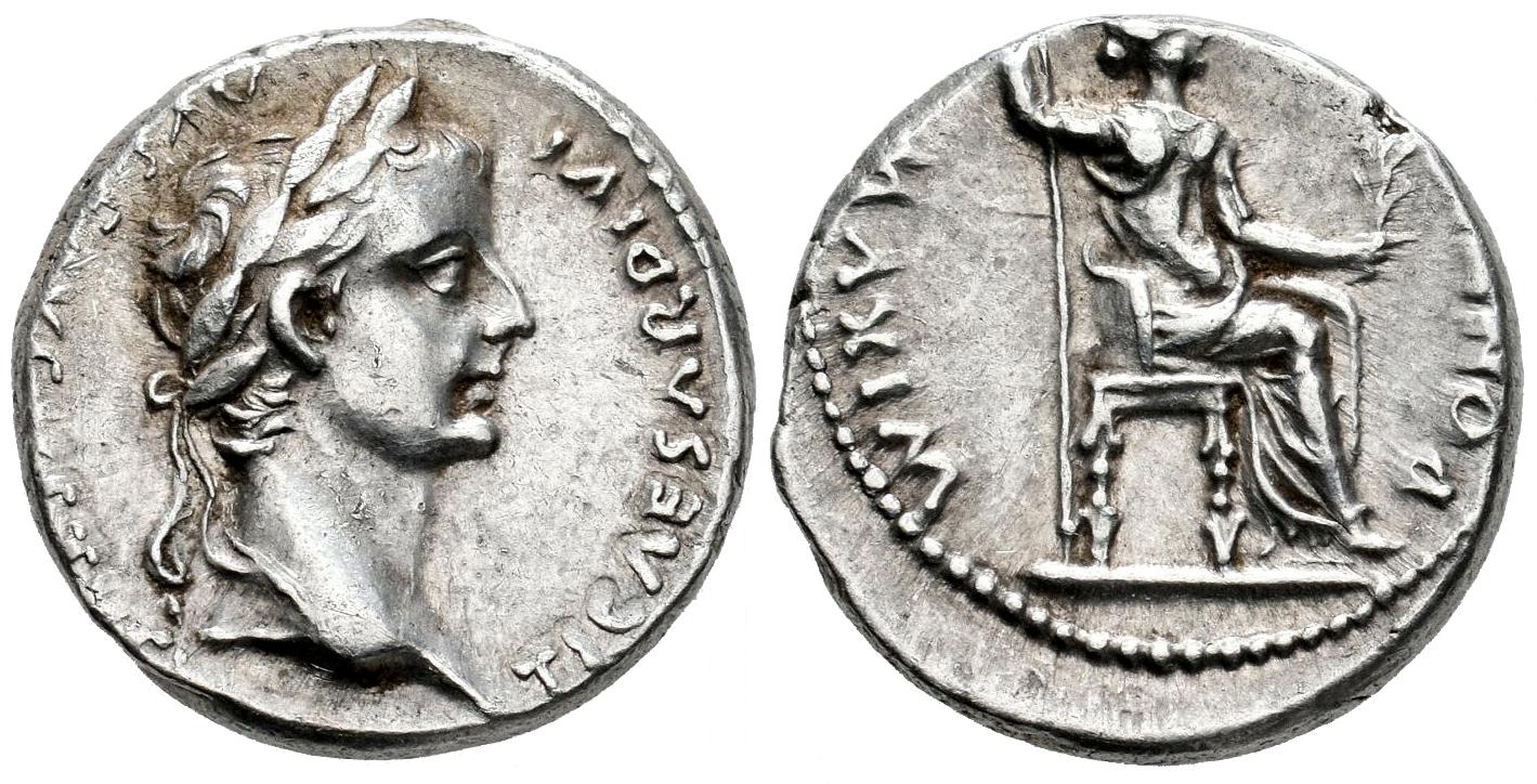 Tiberio. Denario. 14-37 d.C. Lugdunum. (Ric-I 30). (Bmcre-48). (Rsc-16a). Anv.: TI CAESAR DIVI AVG F AVGVSTVS. Cabeza laureada a la derecha. Rev.: PONTIF MAXIM. Livia, como Pax, sedente a la derecha sobre trono con patas ornamentadas, sosteniendo cetro y rama; línea exergual simple. Ag. 3,76 g. EBC-. Est...300,00.