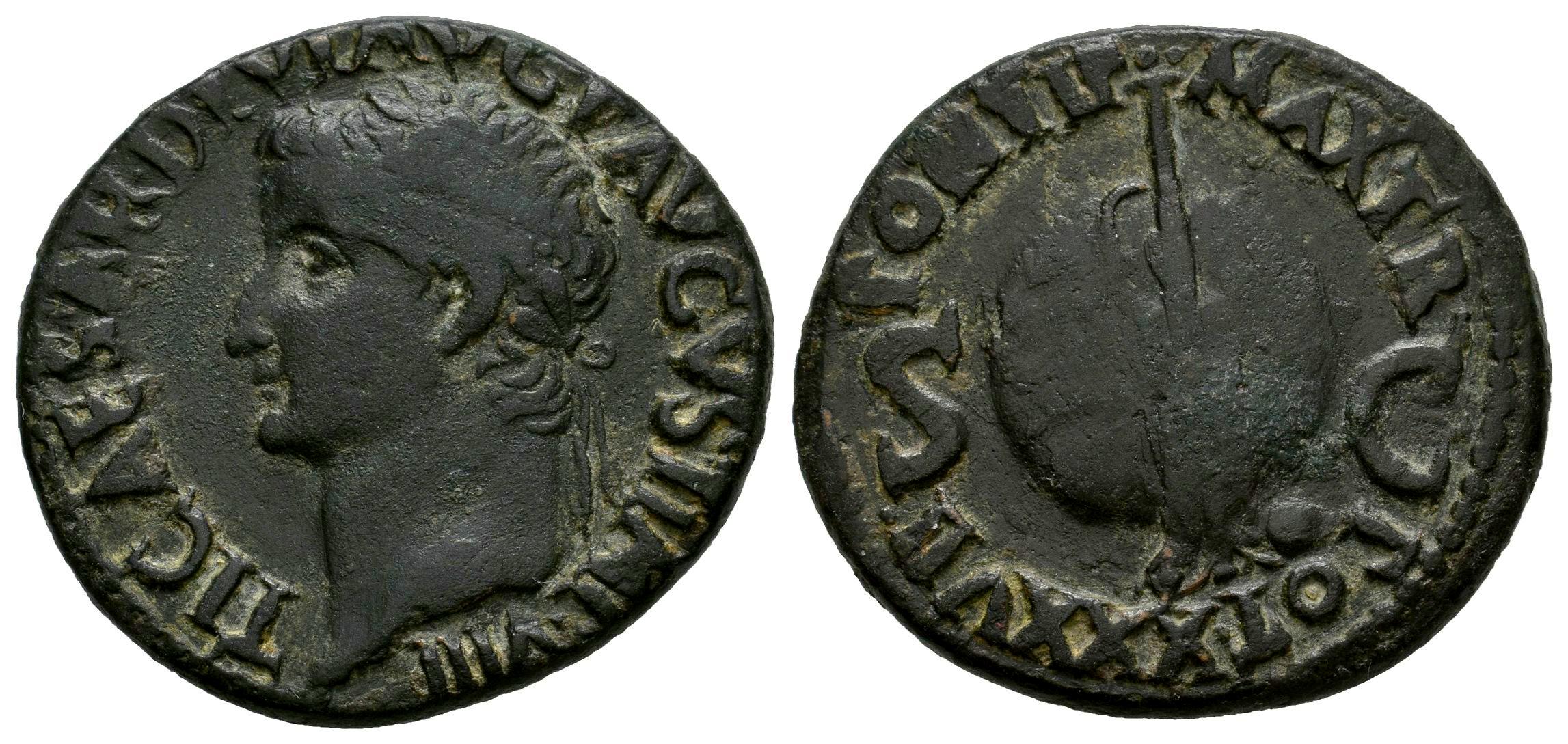 Tiberio. As. 35-36 d.C. Roma. (Ric-I 58). (Bmcre-117). (C-13). Anv.: TI CAESAR DIVI AVG F AVGVST IMP VIII. Cabeza laureada a la izquierda. Rev.: PONTIF MAX TR POT XXXVII. Timón colocado verticalmente sobre un globo con bandas; globo pequeño a la derecha en la base del timón, S-C a través de los campos. Ae. 10,76 g. MBC+/MBC. Est...100,00.