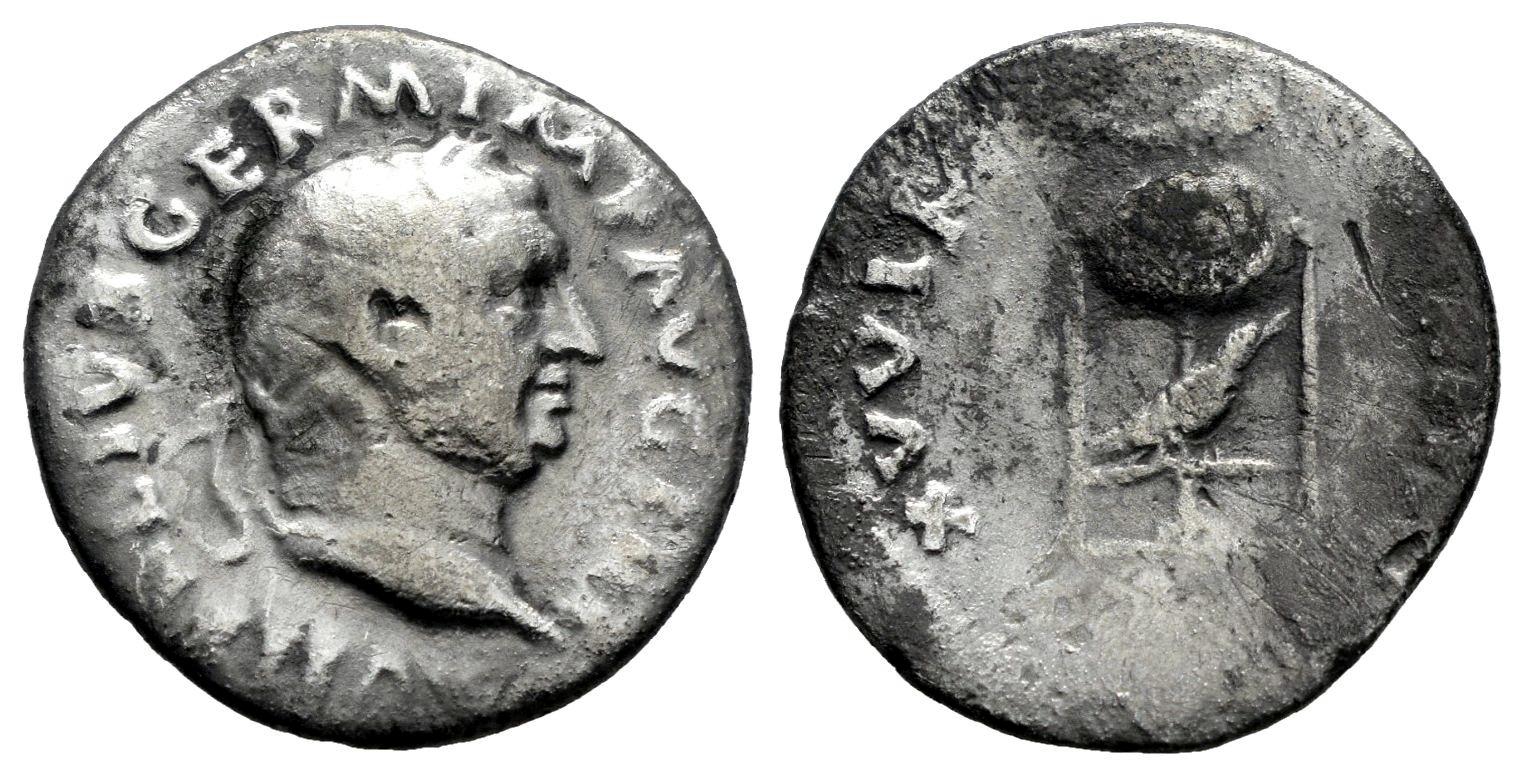 Vitelio. Denario. 69 d.C. Roma. (Ric-I 109). (Bmcre-39/40). (Rsc-111). Anv.: A VITELLIVS GERM IMP AVG TR P. Cabeza laureada a la derecha. Rev.: XV VIR (SACR FAC). Trípode-lebes, delfín a la derecha arriba, cuervo en pie a la derecha abajo. Ag. 2,46 g. BC+/BC. Est...120,00.