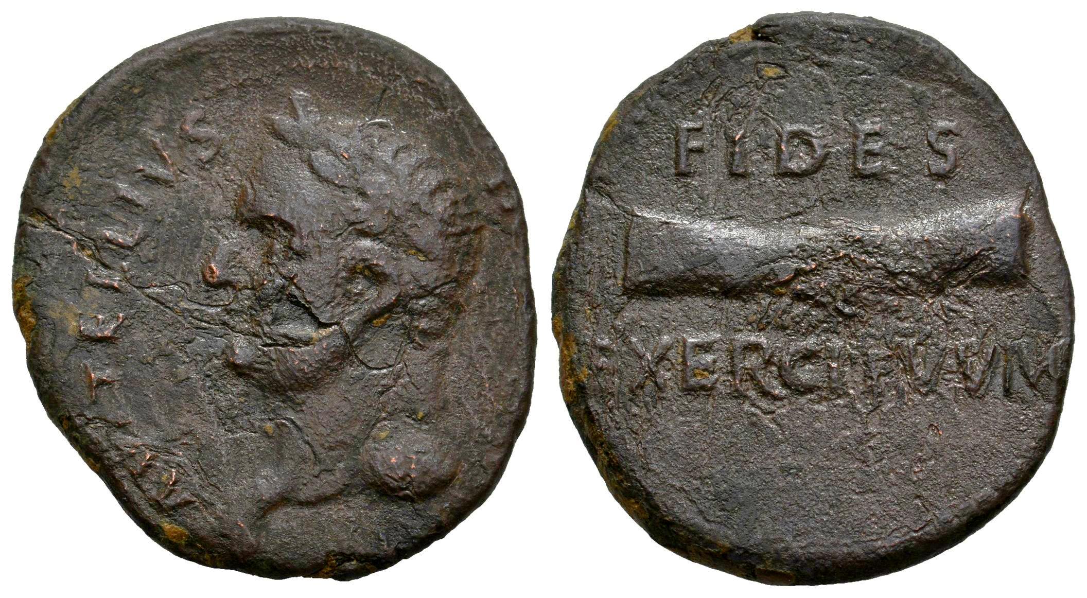 Vitelio. As. 69 d.C. Tarraco. (Ric-I 42 var.). (Bmcre-103 var.). Anv.: A VITELLIVS (IMP GERMAN). Cabeza laureada de Vitelio a la izquierda, con globo en la punta del cuello. Rev.: FIDES - EXERCITVVM. Manos entrelazadas (Sin SC en exergo). Ae. 8,98 g. Leve fallo de cospel. Escasa. BC+. Est...90,00.