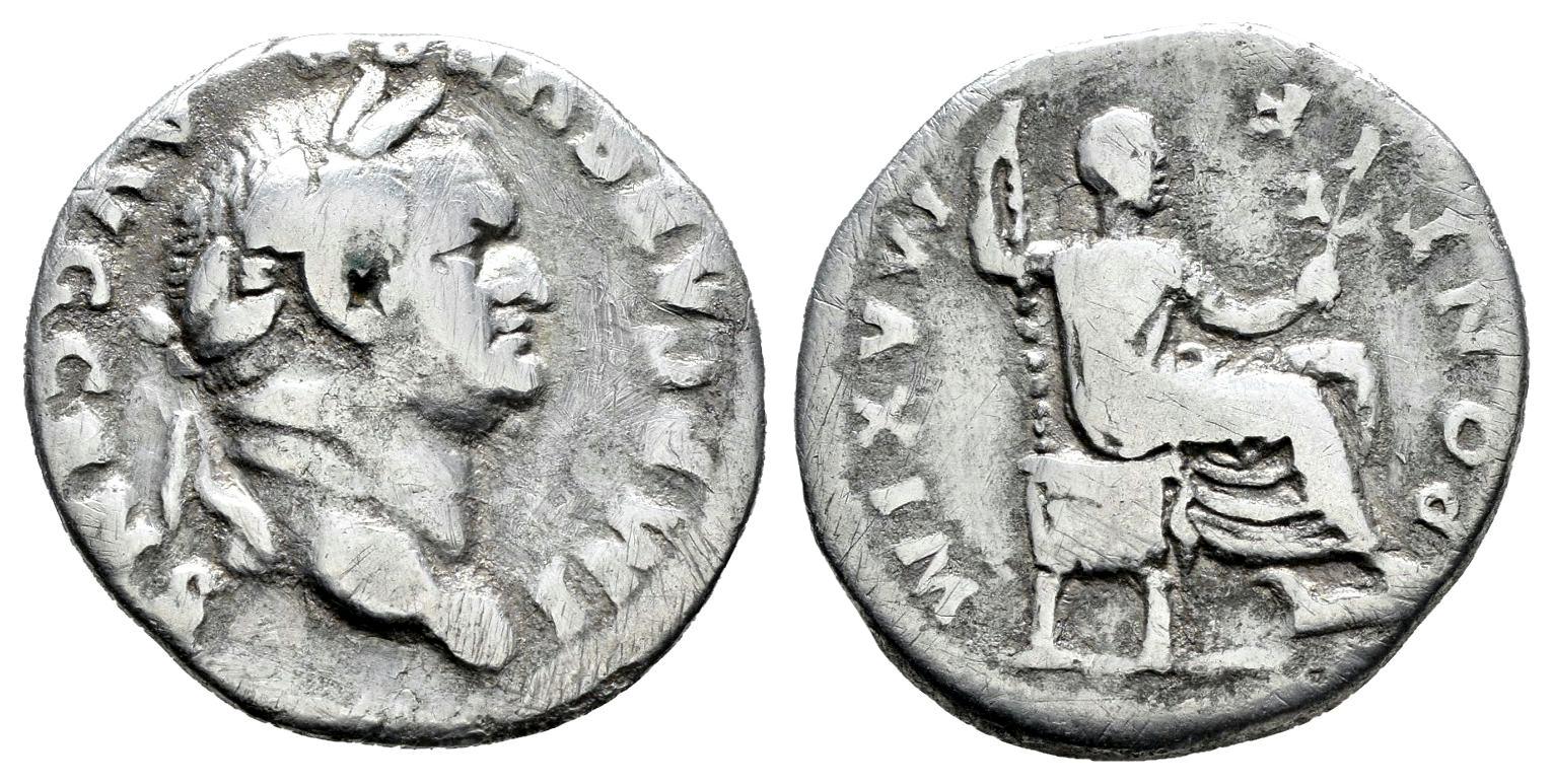 Vespasiano. Denario. 73 d.C. Roma. (Ric-545). (Bmcre-19). (Rsc-387). Anv.: IMP CAES VESP AVG CEN. Cabeza laureada a derecha. Rev.: PONTIF MAXIM. Vespasiano sedente a derecha en sulla curul, portando cetro en la mano derecha y rama de olivo en la izquierda. Ag. 3,02 g. BC+. Est...45,00.