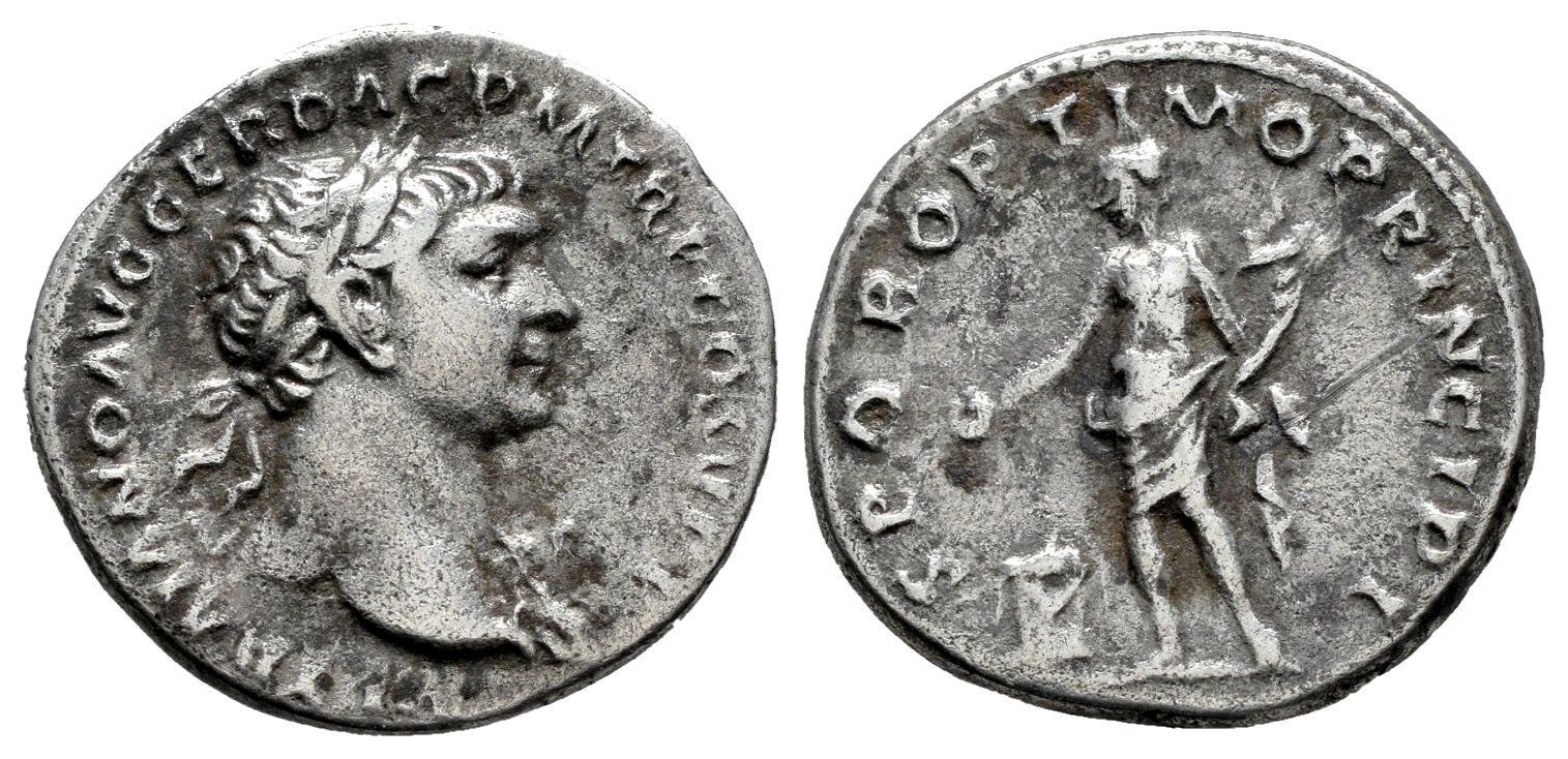 Trajano. Denario. 103-104 d.C. Roma. (Ric-II 183). (Woytek-217c). (Bmcre-209). Anv.: IMP TRAIANO AVG GER DAC P M TR P COS V P P. Busto laureado a la derecha, con aegis. Rev.: S P Q R OPTIMO PRINCIPI. Genio en pie a la izquierda, sosteniendo pátera sobre altar y cornucopia. Ag. 3,16 g. MBC-. Est...60,00.
