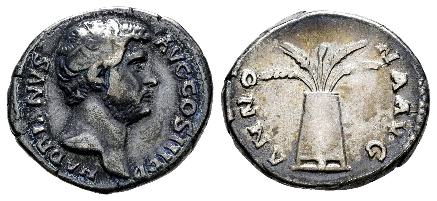 Adriano. Denario. 137-138 d.C. Roma. (Ric-II 3 2318). (Bmcre-595). (Rsc-172). Anv.: HADRIANVS AVG COS III P P. Cabeza desnuda a la derecha. Rev.: ANNONA AVG. Modio con espigas y amapola. Ag. 3,35 g. Pátina con ligero tono. MBC-/MBC. Est...75,00.