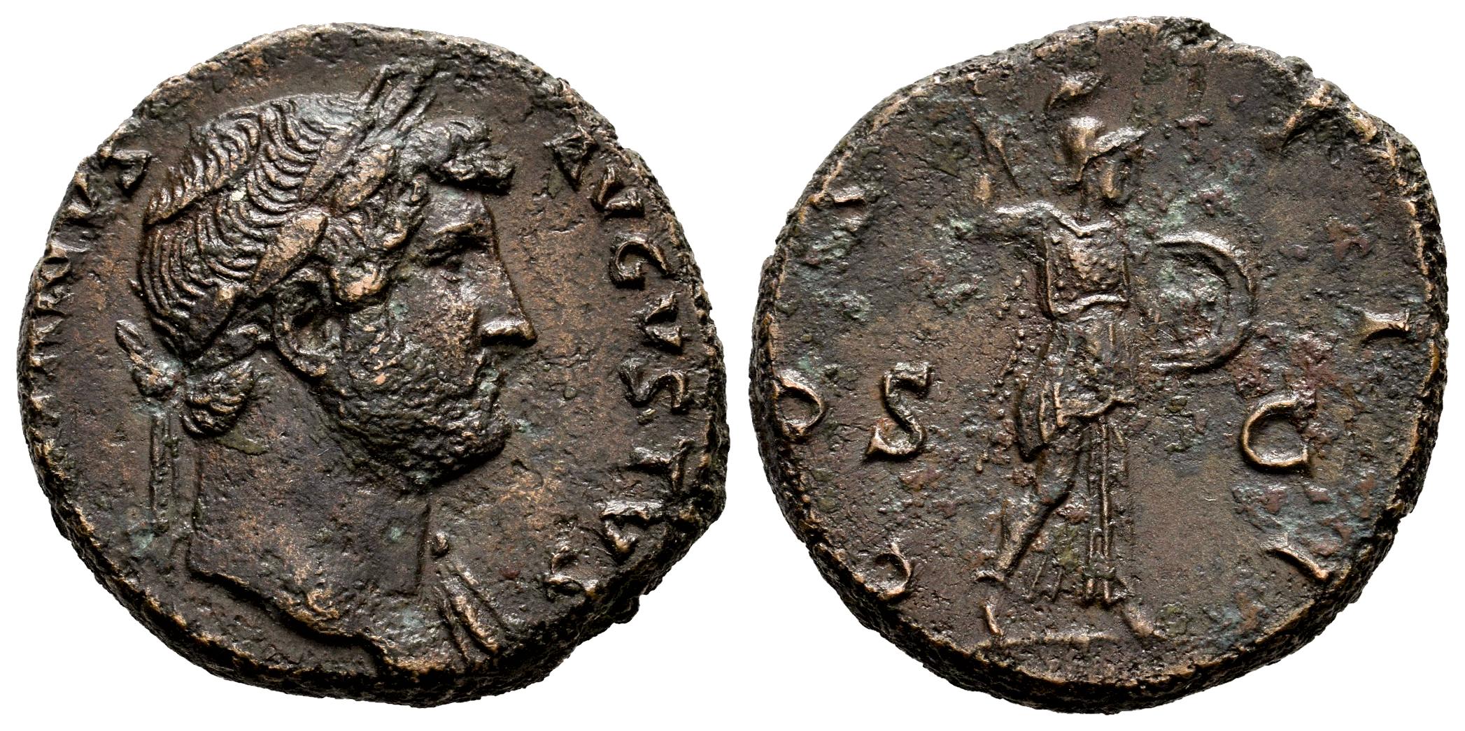 Adriano. As. 124-128 d.C. Roma. (Ric-664). (Bmcre-1337). Anv.: HADRIANVS AVGVSTVS. Cabeza laureada a derecha, con ligero drapeado sobre el hombro. Rev.: COS III. Minerva avanzando a derecha, portando javalina y escudo, en el campo S-C. Ae. 12,13 g. Oxidaciones limpiadas. MBC-. Est...100,00.