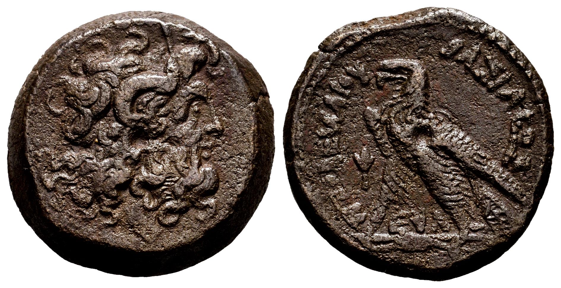 Egipto Ptolemaico. Ptolomeo VI Philometor. Óbolo. 180-164 d.C. Chipre. (Sng Cop-294). (Svoronos-1398). Anv.: Cabeza de Zeus Ammon a derecha. Rev.: BAΣIΛEΩΣ ΠTOΛEMAIOY. Águila con las alas cerradas de pie a la izquierda sobre un rayo; a la izquierda, flor de loto; entre las patas del águila, EYΛ. Ag. 11,39 g. MBC-. Est...65,00.