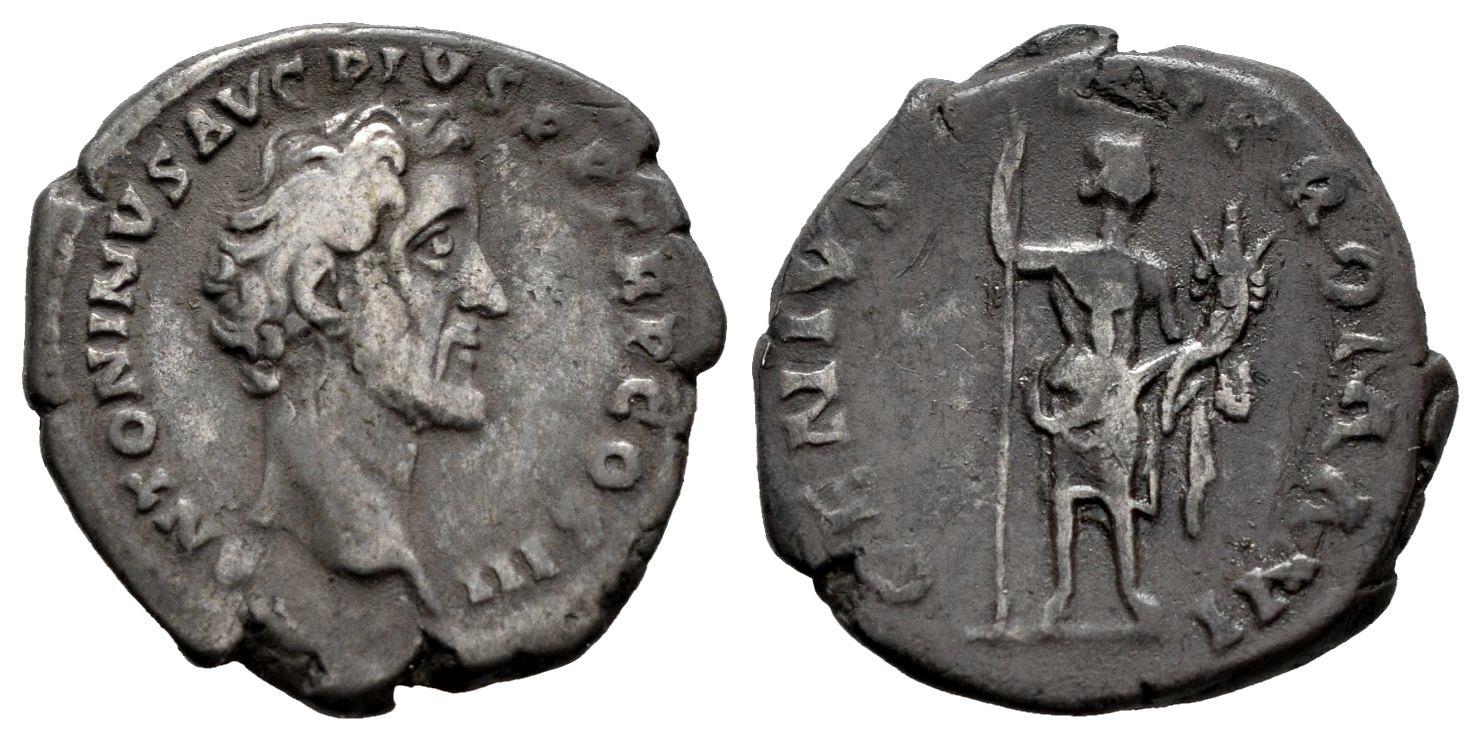 Antonino Pío. Denario. 140-144 d.C. Roma. (Ric-III 70). (Bmcre-207). (Rsc-405). Anv.: ANTONINVS AVG PIVS P P TR P COS III. Cabeza desnuda a la derecha. Rev.: GENIVS POP ROMANI. Genio en pie de frente, mirando a la derecha, sosteniendo cetro y cornucopia. Ag. 2,63 g. Pátina. Ex Noonans (18/07/2023), lote 1465. MBC-. Est...80,00.