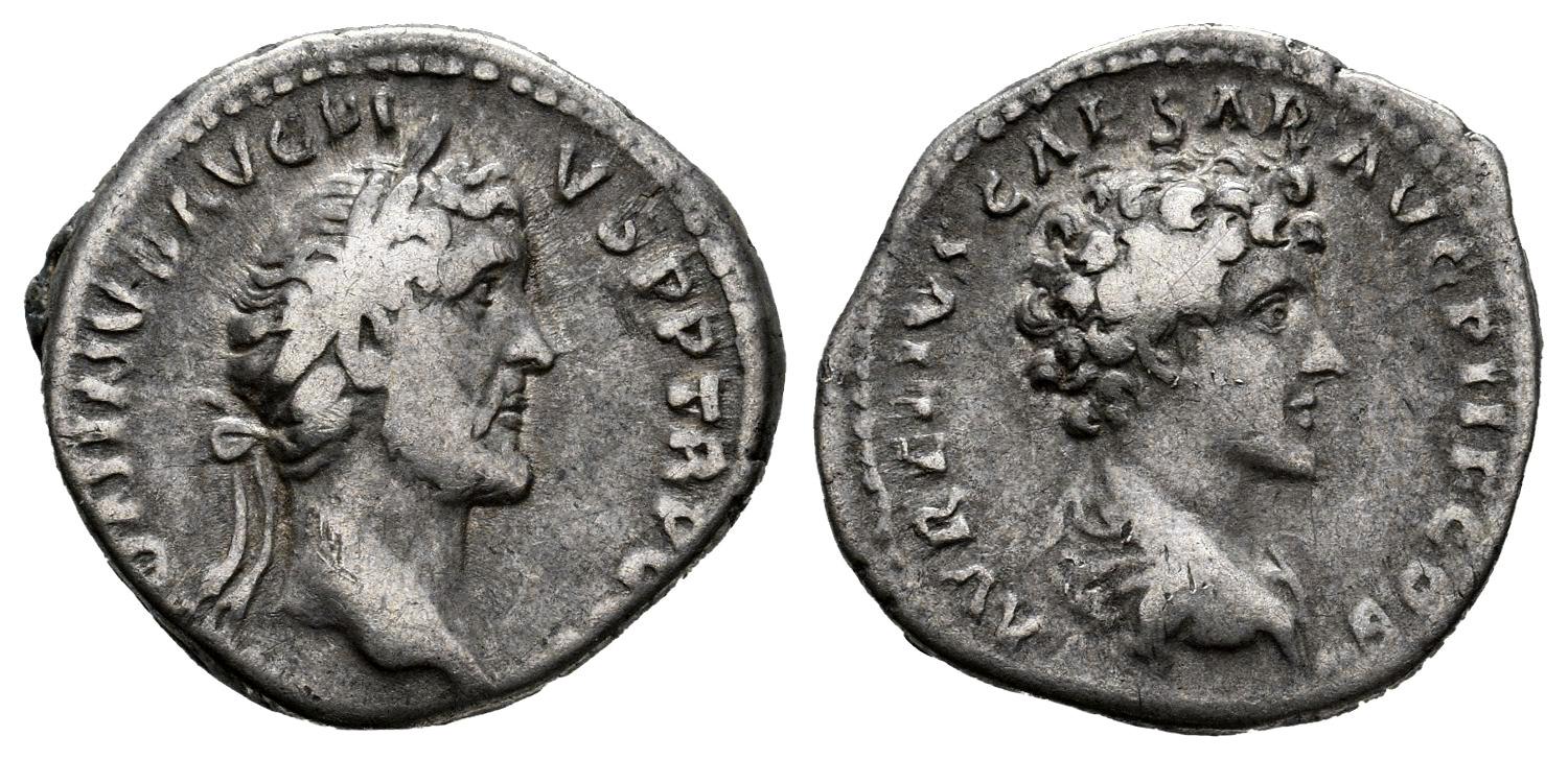 Antonino Pío y Marco Aurelio. Denario. 140 d.C. Roma. (Ric-III 417b). (Bmcre-160). (Rsc-22a). Anv.: ANTONINVS AVG PIVS P P TR P C(OS III). Cabeza laureada de Pío a la derecha. Rev.: AVRELIVS CAESAR AVG PII F COS. Busto de Aurelio con la cabeza desnuda y drapeado a la derecha. Ag. 3,39 g. MBC-. Est...80,00.