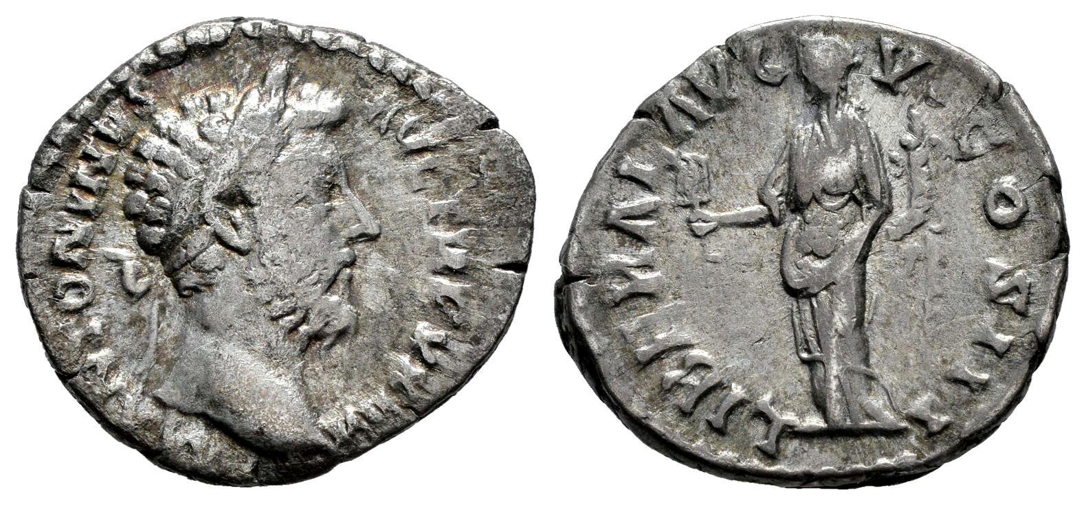 Marco Aurelio. Denario. 168-169 d.C. Roma. (Ric-III 206). (Bmcre-492). (Rsc-412). Anv.: M ANTONINVS AVG TR P XXIII. Cabeza laureada a la derecha. Rev.: LIBERAL AVG V COS III. Liberalitas en pie de frente, mirando a izquierda, sosteniendo ábaco y cornucopia. Ag. 3,03 g. BC+/MBC-. Est...50,00.