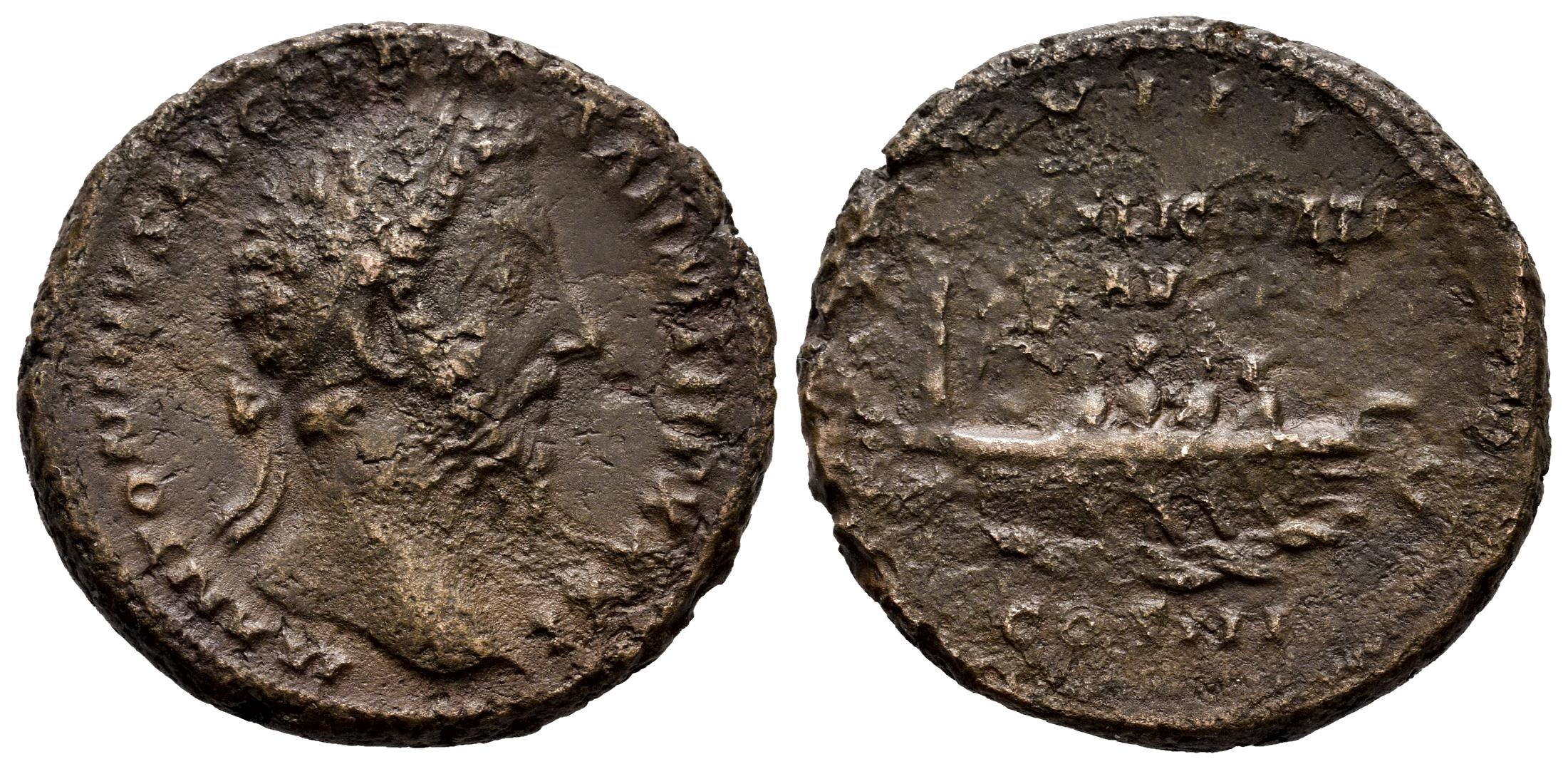 Marco Aurelio. As. 176-177 d.C. Roma. (Ric-1195). (Bmc-191). Anv.: M ANTONINVS AVG GERM SARM TR P XXXI. Cabeza laureada a derecha. Rev.: FELICITATI AVG / P-P; alrededor, IMP VIII COS III; en el exergo, COS III Barco con tres remeros a la izquierda; en la popa, Neptuno de pie a la derecha, apoyando el pie derecho en una roca, sosteniendo el tridente con la mano izquierda y el aplustre con la derecha. Ae. 11,07 g. Oxidaciones limpiadas. MBC-/BC+. Est...100,00.