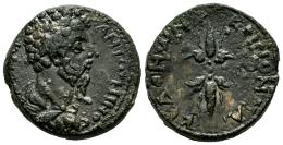 Marco Aurelio. AE 25. 161-180 d.C. Koinon. (Varbanov-3054). Anv.: (ΚΑΙСΑΡ) ΑΝΤѠΝЄΙΝΟС. Busto a dercha. Rev.: ΚOΙΝOΝ ΜΑΚЄΔOΝѠΝ. Rayo alado. Ae. 15,24 g. Escasa. MBC-. Est...60,00.