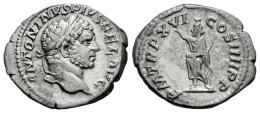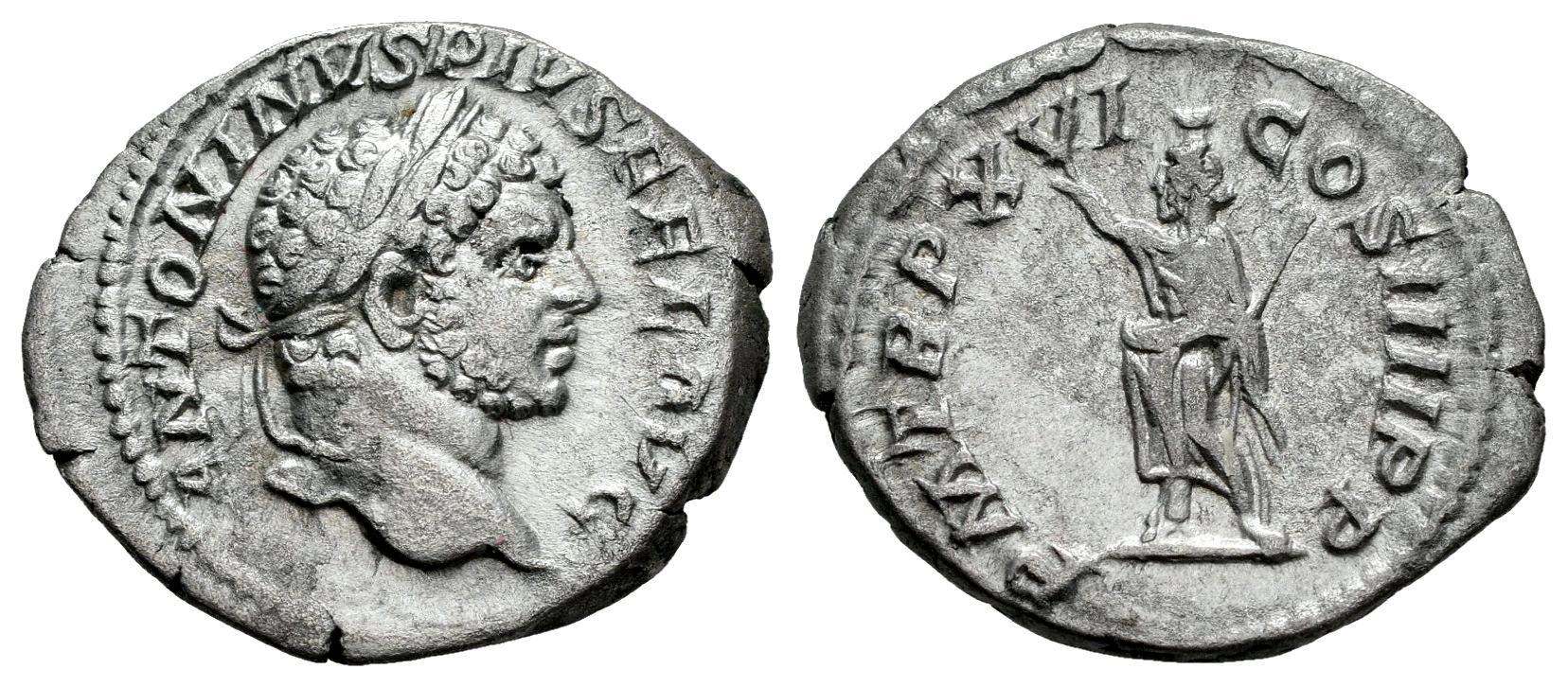 Caracalla. Denario. 213 d.C. Roma. (Ric-IV 208b). (Bmcre-56). (Rsc-212). Anv.: ANTONINVS PIVS FEL AVG. Cabeza laureada a la derecha. Rev.: P M TR P XVI COS IIII P P. Serapis en pie a izquierda, polos en cabeza, mano levantada y sosteniendo cetro transversal. Ag. 3,12 g. MBC. Est...60,00.