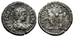 Geta. Denario. 200-202 d.C. Roma. (Ric-IV 18). (Bmcre-234). (Rsc-157b). Anv.: P SEPT GETA CAES PONT. Busto con la cabeza desnuda y drapeado a la derecha. Rev.: PRINC IVVENTVTIS. Príncipe en pie a la izquierda, sosteniendo una rama y una lanza; trofeo detrás. Ag. 2,98 g. MBC-. Est...50,00.