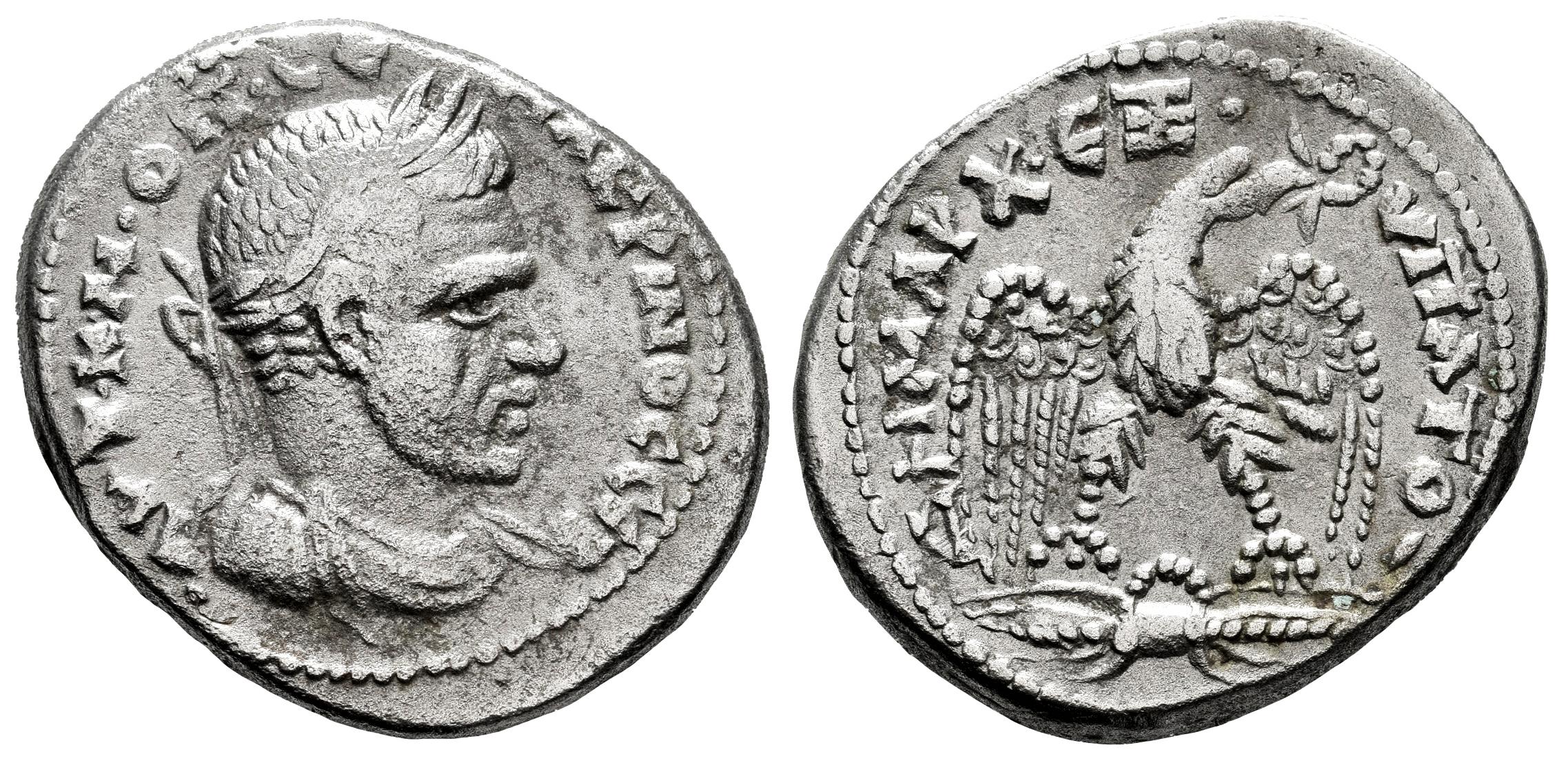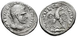 Macrino. Seleucis y Pieria. Tetradracma. 217-218 d.C. Antioquía. (Prieur-1190). Anv.: ΑΥΤ•Κ•Μ•ΟΠ•CЄ ΜΑΚΡΙΝΟC CЄΒ. Busto laureado, drapeado y cubierto de Macrino a derecha. Rev.: ΔΗΜΑΡΧ•ЄΞ•ΥΠΑ ΤΟ• Águila con las alas desplegadas, de pie, de frente, sobre un rayo, con la cabeza hacia la derecha y sosteniendo una corona en el pico. Ag. 13,33 g. MBC-/MBC. Est...120,00.