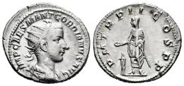 Gordiano III. Antoniniano. 240 d.C. Roma. (Ric-IV 37). (Rsc-210). Anv.: IMP CAES M ANT GORDIANVS AVG. Busto radiado, drapeado y con coraza a la derecha. Rev.: P M TR P II COS P P. Emperador en pie a la izquierda, sacrificando con una patera sobre un altar iluminado y sosteniendo una vara. Ag. 4,35 g. MBC+/EBC-. Est...50,00.