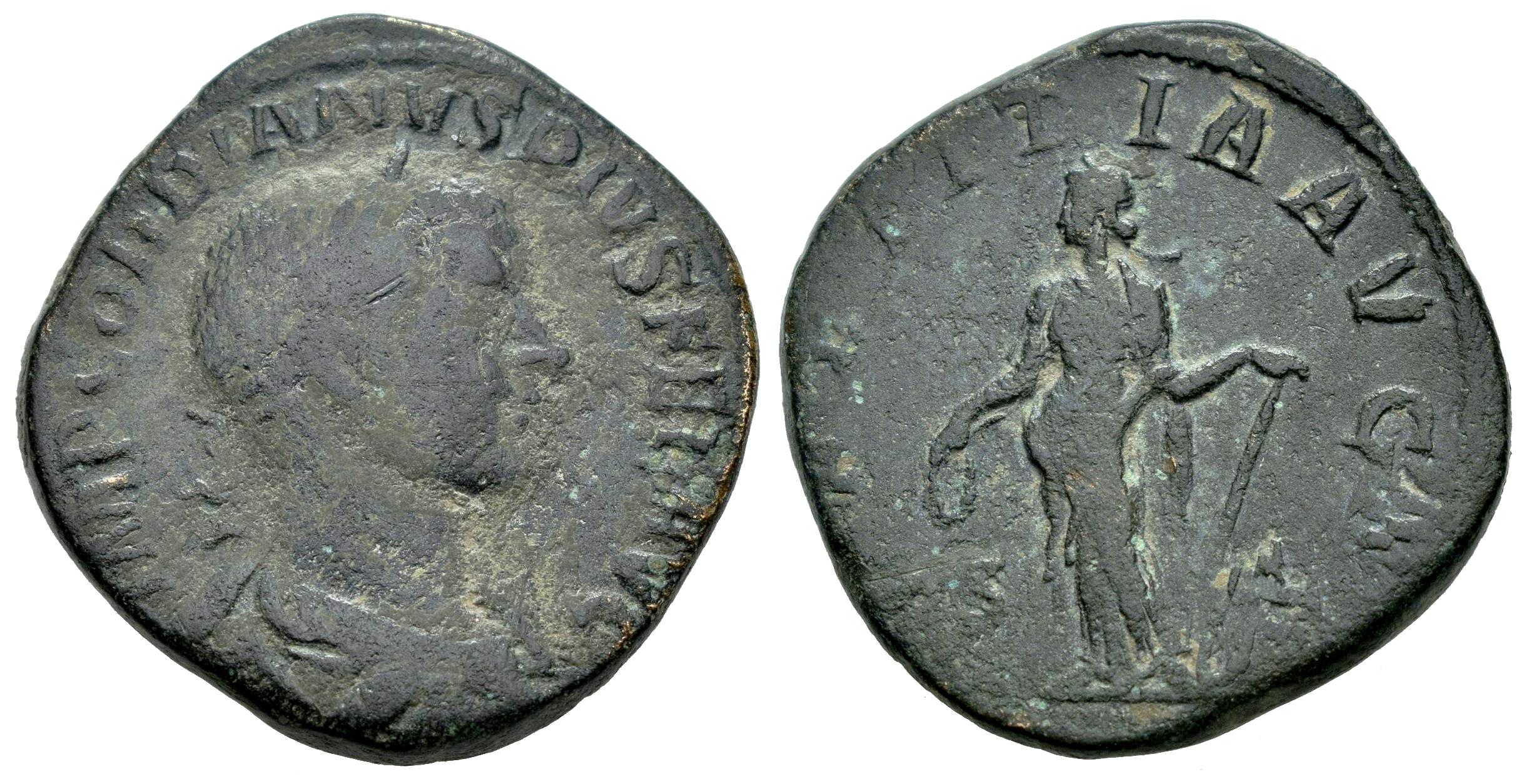 Gordiano III. Sestercio. 241-243 d.C. Roma. (Ric-300a). Anv.: IMP GORDIANVS PIVS FEL AVG. Busto laureado, drapeado y acorazado de Gordiano III hacia la derecha. Rev.: LAETITIA AVG N. Laetitia de pie a la izquierda, con corona y ancla; S-C en campos. Ae. 18,24 g. BC+. Est...60,00.