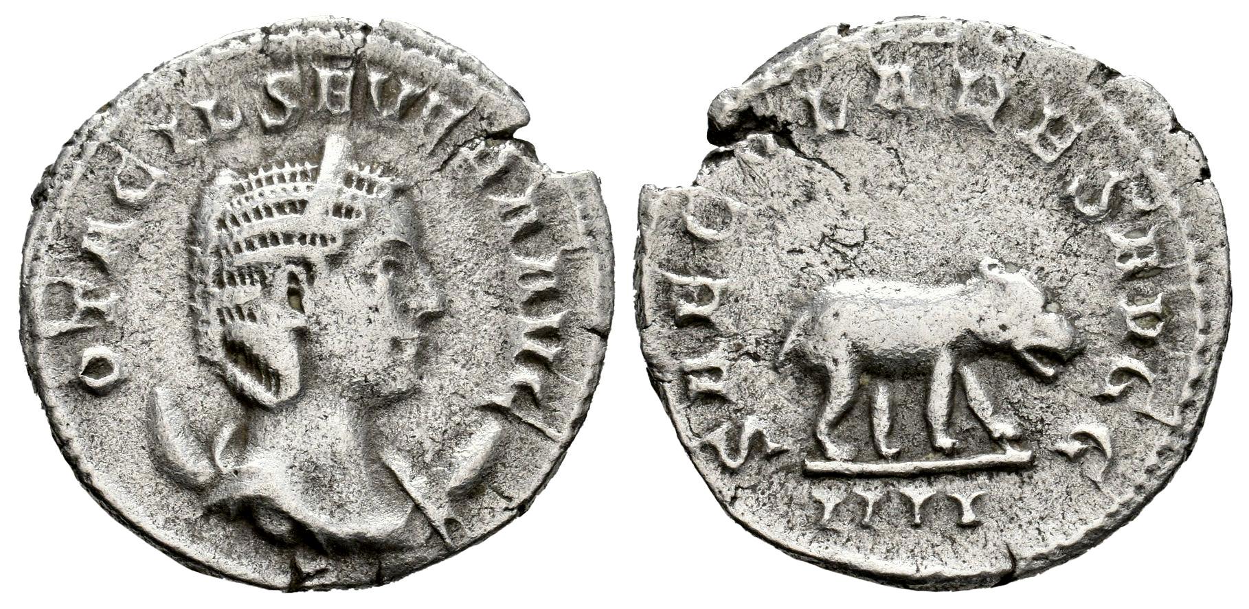 Otacilia Severa. Antoniniano. 248 d.C. Roma. Ludi Saeculares, conmemorantiva del 1000 aniversario de Roma. (Ric-116b). (Seaby-63). Anv.: OTACIL SEVERA AVG. Busto con diadema y drapeado a la derecha. Rev.: SAECVLARES AVGG. Hipopótamo avanzando a la derecha; IIII en exergo. Ag. 4,00 g. Escasa. MBC. Est...60,00.