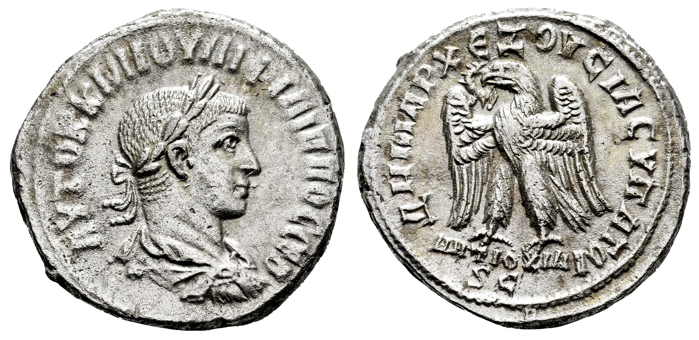 Filipo II. Seleucis y Pieria. Tetradracma. 248 d.C. Antioquía. (Prieur-473). (McAlee-1043). Anv.: AYTOK K M IOYΛI ΦIΛIΠΠOC CЄB. Busto laureado, drapeado y con coraza a derecha. Rev.: ΔHMAPX ЄΞOYCIAC YΠA TO Δ. Águila en pie a izquierda, sosteniendo corona en el pico, alas extendidas; ANTIOXIA SC en exergo. Ag. 13,54 g. MBC+/EBC-. Est...120,00.