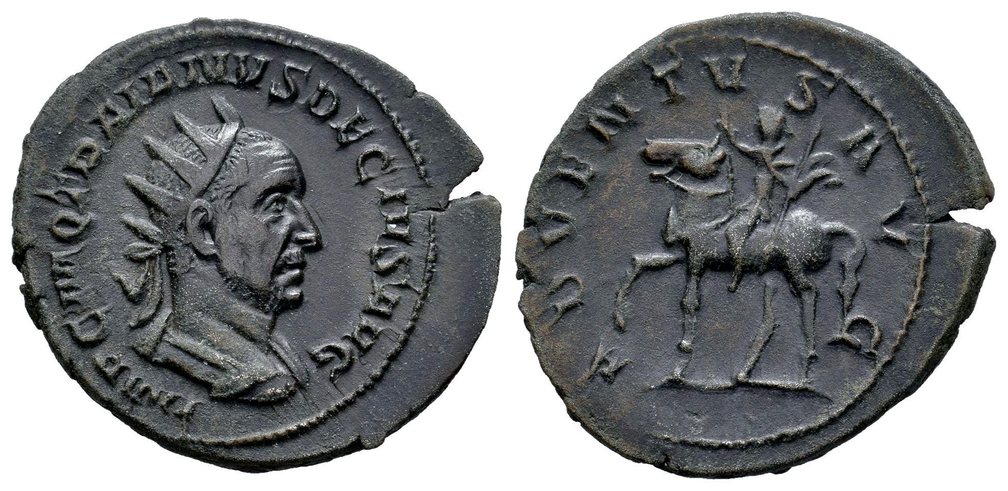 Trajano Decio. Antoniniano. 249-251 d.C. Roma. (Ric-IV 11b). (Rsc-4). Anv.: IMP C M Q TRAIANVS DECIVS. Busto radiado, drapeado y con coraza a la derecha. Rev.: ADVENTVS AVG. Emperador a caballo a la izquierda, sosteniendo cetro. Ag. 4,07 g. Pátina original. MBC+. Est...60,00.