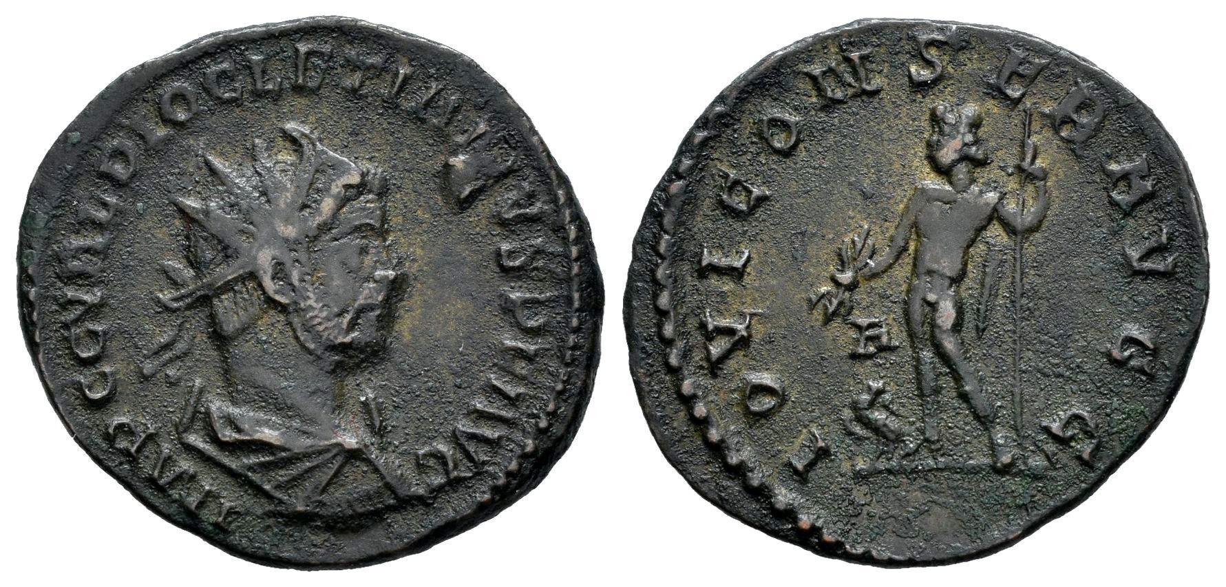 Diocleciano. Antoniniano. 286 d.C. Lyon. (Ric-35). Anv.: IMP C C VAL DIOCLETIANVS P F AVG. Busto radiado, drapeado y con coraza a la derecha. Rev.: IOVI CONSERVAT AVGG. Júpiter en pie a la izquierda, sosteniendo rayo y cetro, águila a sus pies a la izquierda; A en el campo izquierdo. Ae. 2,94 g. MBC-/MBC. Est...30,00.