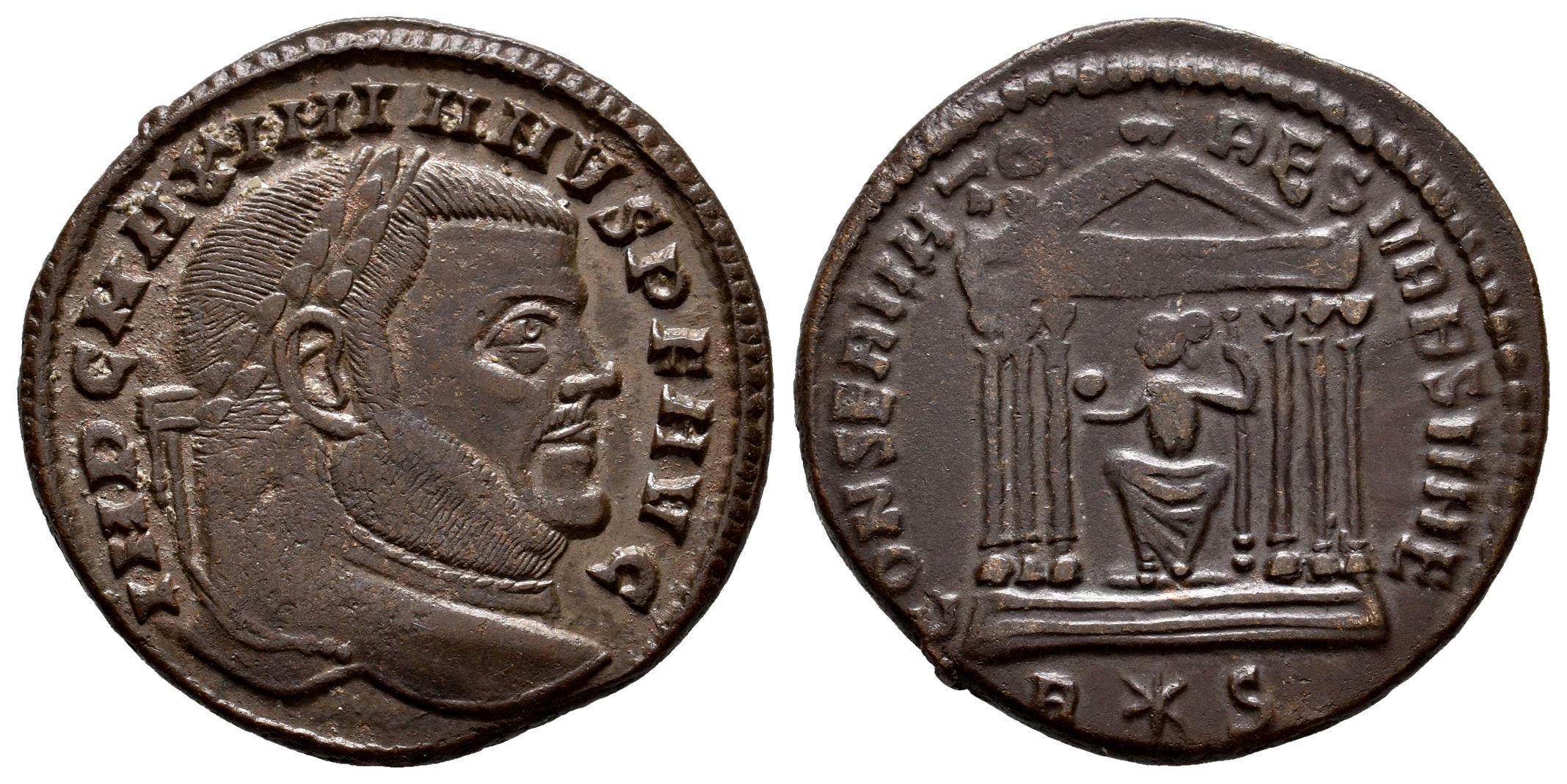 Maximiano. Follis. 307 d.C. Roma. (Ric-VI 194b). Anv.: IMP C MAXIMIANVS P F AVG. Cabeza laureada a la derecha. Rev.:  CONSERVATORES VRB SVAE. Roma sedente de frente, mirando a la izquierda, sosteniendo globo y cetro, dentro de templo hexástilo; R*P en exergo. Ae. 6,99 g. EBC-. Est...50,00.