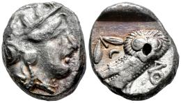 Attica. Atenas. Tetradracma. 350-394 a.C. Imitación oriental. (Kroll-8). (Sng Cop-31). Anv.: Cabeza de Atenea a la derecha, con pendiente, collar y casco ático con cresta decorado con tres hojas de olivo sobre la visera y una palmeta en espiral en el cuenco. Rev.: Búho en pie a la derecha con la cabeza de frente, ramita de olivo con baya y creciente en el campo superior izquierdo, AΘ(E) a la derecha; todo dentro de un cuadrado incuso. Ag. 17,07 g. Bonito tono. Golpe de punzón en reverso. MBC-. Est...400,00.