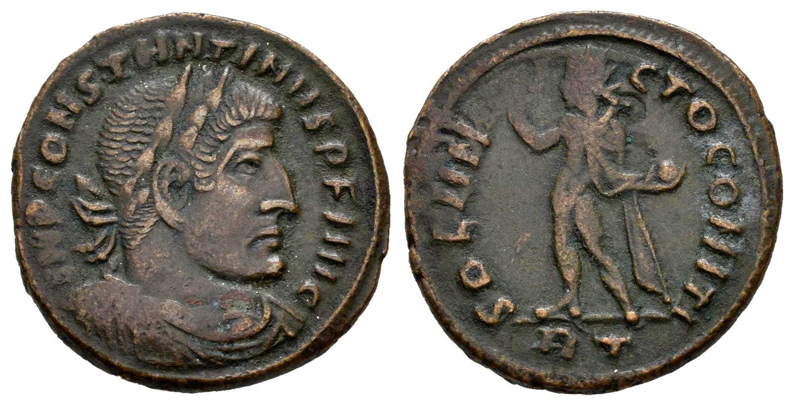 Constantino I. Follis. 316-317 d.C. Roma. (Ric-VII 57). Anv.: IMP CONSTANTINVS P F AVG. Busto laureado, drapeado y con coraza a la derecha. Rev.: SOLI INVICTO COMITI. Sol en pie a la izquierda, levantando la mano y sosteniendo globo; RT en exergo . Ae. 3,33 g. MBC. Est...25,00.