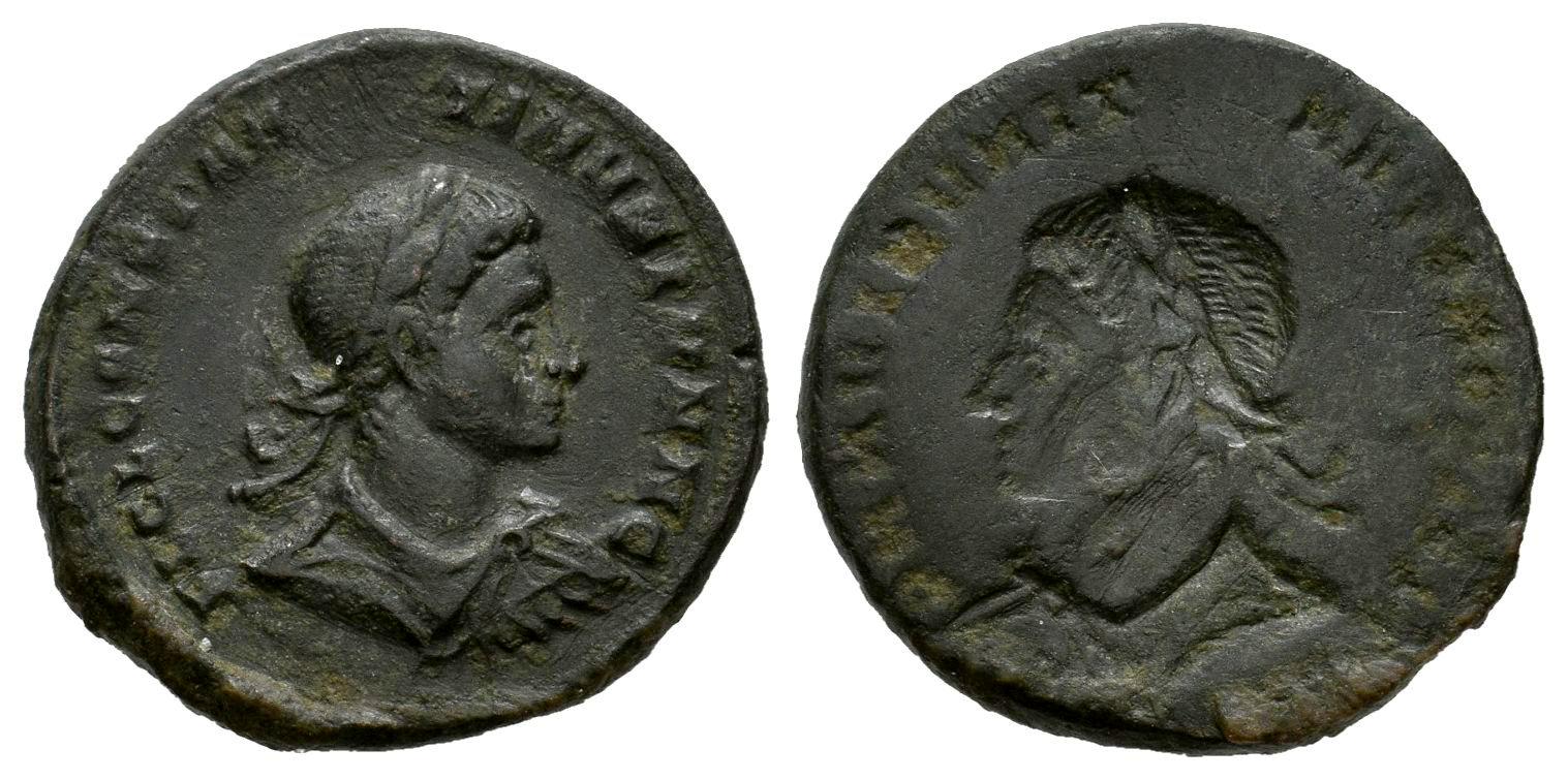 Constantino II. Follis incuso. 318 d.C. Anv.: FL CL CONSTANTINVS IVN N C. Busto laureado, drapeado y con coraza a la derecha. Rev.: Incuso de anverso. Ae. 3,54 g. Escasa . MBC+. Est...100,00.