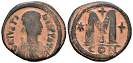 Justino I. 40 Nummi. 518-527 d.C. Constantinopla. (MIBE-11). (Doc-8). (Sear-62). Anv.: D N IVSTINVS P P AVG. Busto con diadema, drapeado y coraza a la derecha. Rev.: M grande; cruz arriba, estrella y cruz a los lados, Δ abajo, CON en exergo. Ae. 17,35 g. Pátina artificial. MBC-/MBC. Est...25,00.
