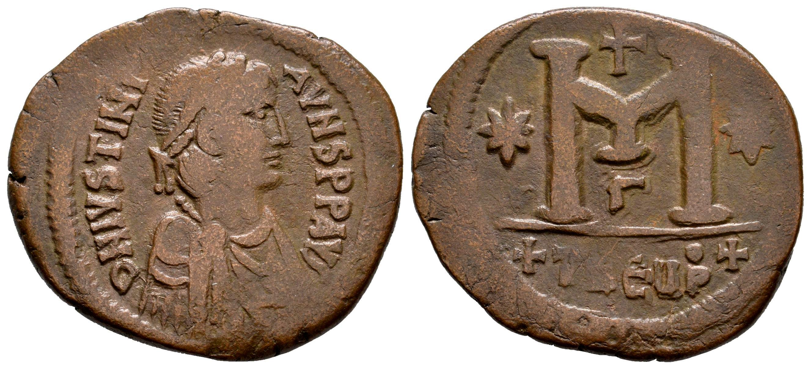 Justiniano I. Follis. 533-537 d.C. Theoupolis (Antioquía). (Doc-210c). (MIB-126). (SB-216). Anv.: D N IVSTINIANVS P P AVG. Busto con diadema, drapeado y coraza, a la derecha. Rev.: Gran M entre dos estrellas; arriba, cruz; abajo, Γ; en el exergo, +THEЧP+. Ae. 12,66 g. MBC/MBC-. Est...50,00.